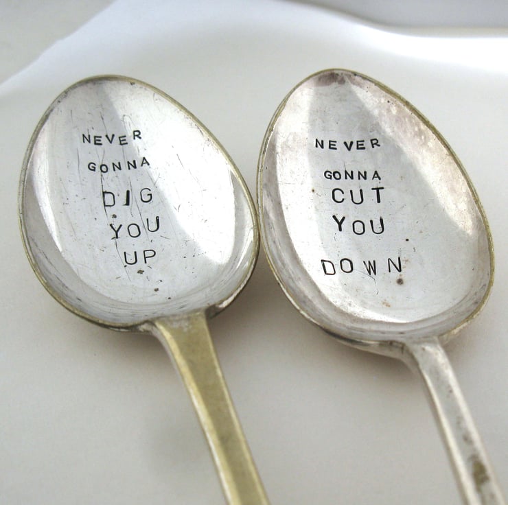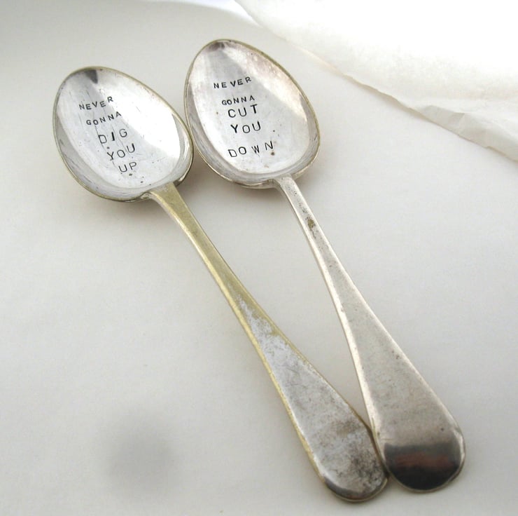 Now you can rickroll people in your own garden with this pair of garden plant labels made from hand stamped vintage dessertspoons with a humorous take on a very famous song and its possibly even more famous internet meme.