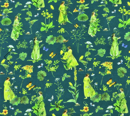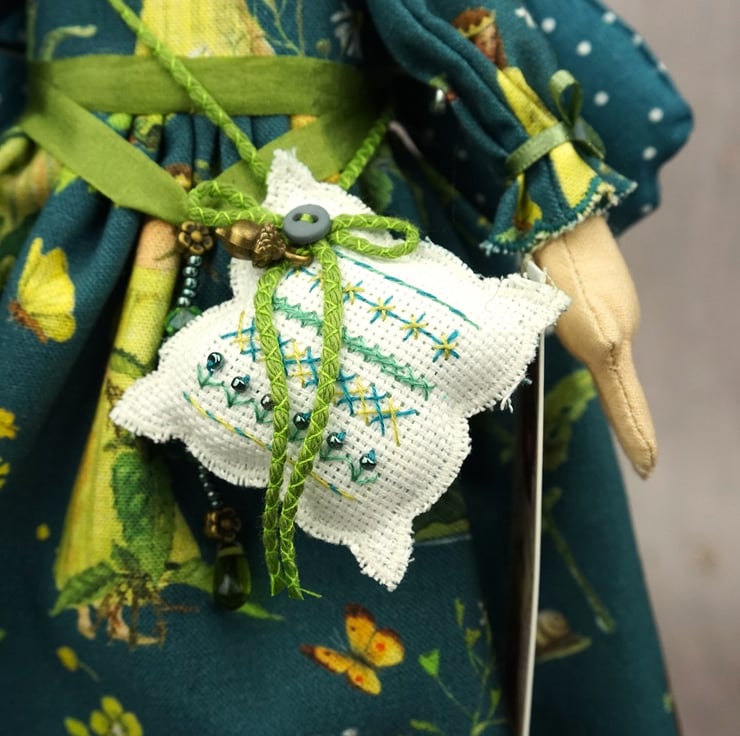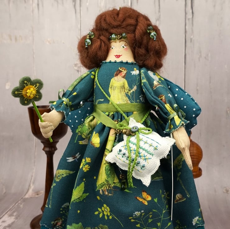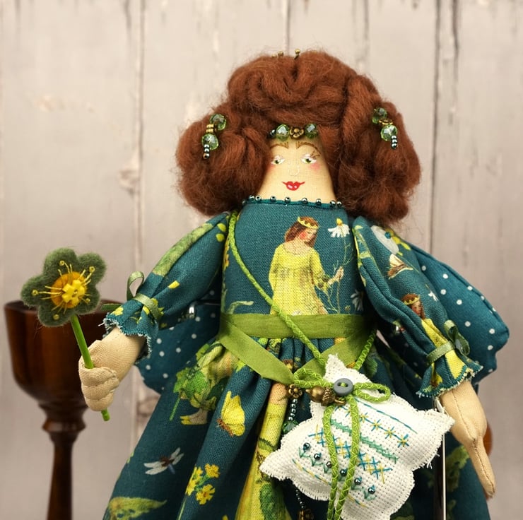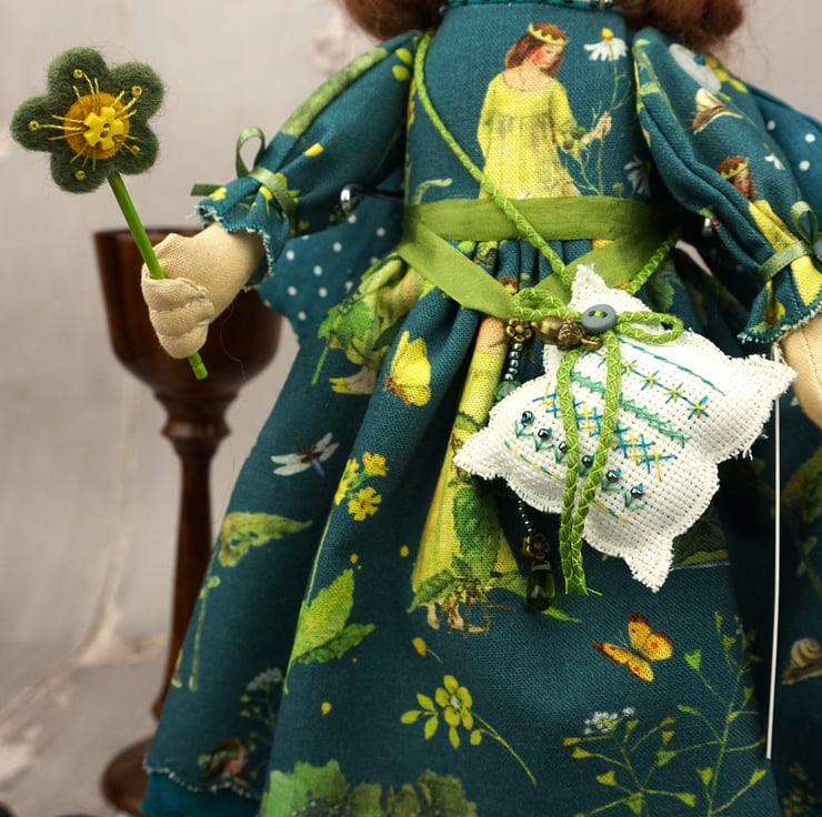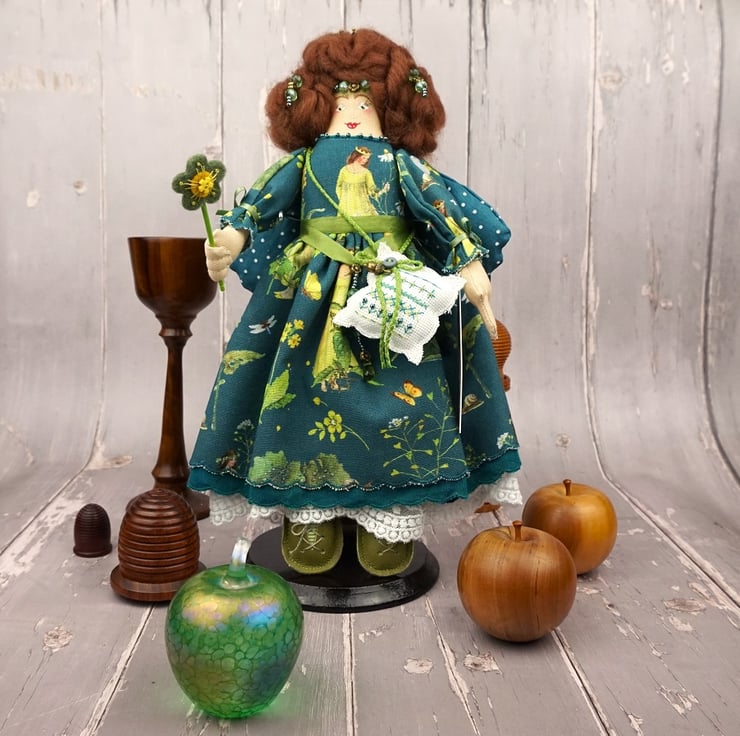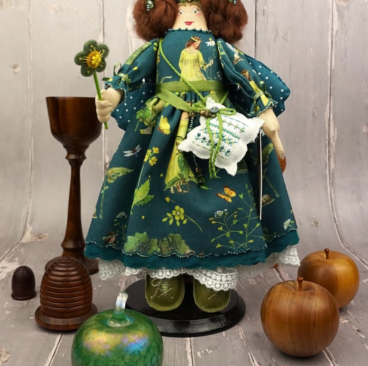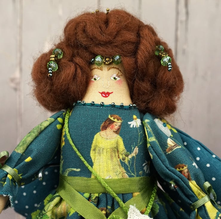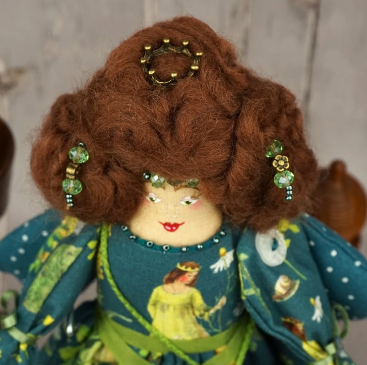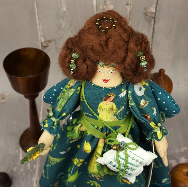 This is Maud, a meadow Fairy Queen. A smaller pattern, she is about two thirds the size of my witch. This little Fairy Queen has an Acufactum print dress called Meadow Queen with a deep peacock ground.. The fabric has fae meandering among meadow flowers.. She has wings that team her underskirt and sports a little felt wand. Her shoes are the smallest I have ever made and are leather. She has a piece of Moss Agate to her heart with rosemary in her stuffing and is finished with tiny buttons, silk ribbon and a little coronet in her hair. Her hair is hand styled into gothic proportions with glass and crystal bead details and a head piece to add to the medieval feel.