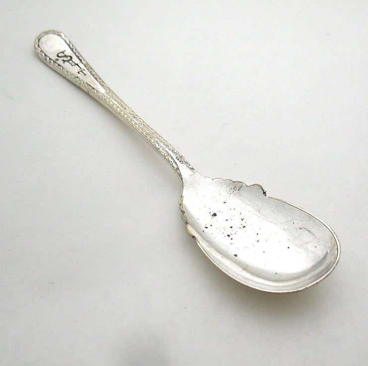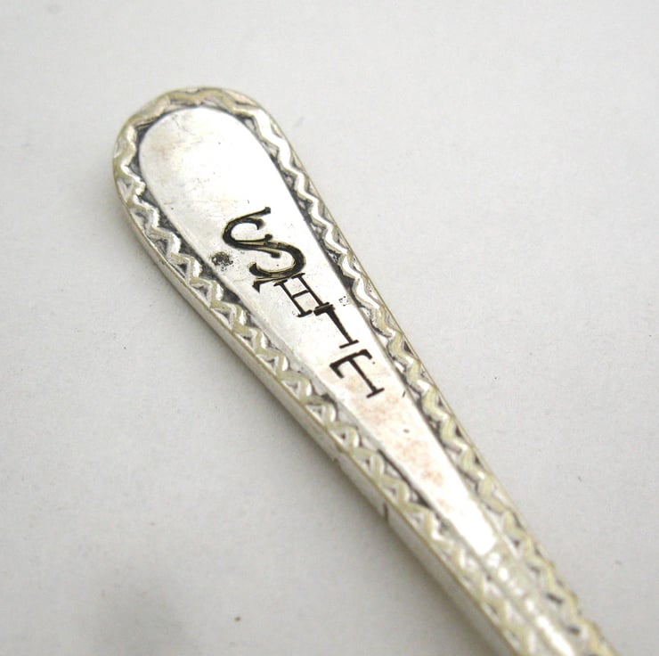 A rather rude hand stamped vintage silver plated jam spoon with 'SH-T' stamped on the handle, making use of the original 'S' monogram. Because why not. Sometimes a bit of rudity is just what you need to get through the day. Along with a nice sticky jar of jam or preserves.