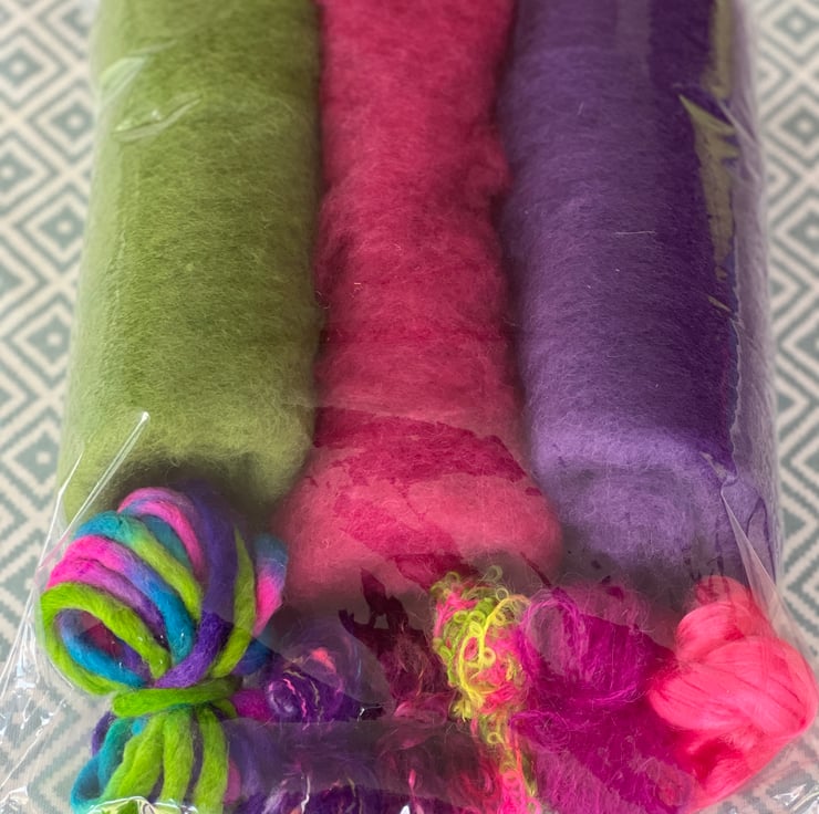 This kit includes all the materials required to make one bowl with an optional turned-over rim (and you will have some materials left over) in a complementary green, pink and purple colourway with similar coloured wool yarn and bamboo embellishment highlights. The photos show an example of a bowl made from a similar kit. Please note you will need to purchase your felting on a ball equipment separately (you will need the smaller green felting ball - see separate listing).