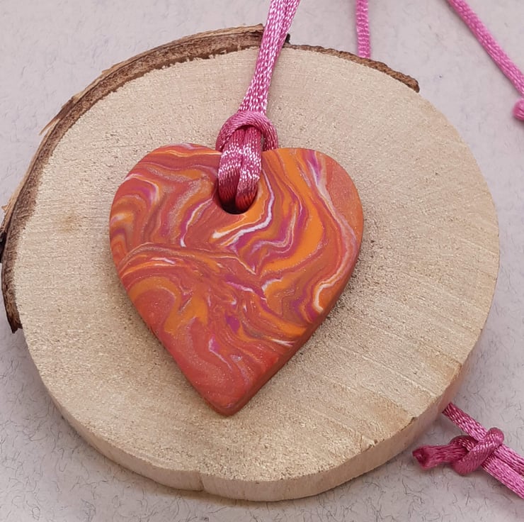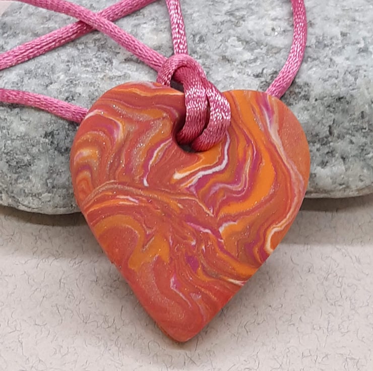 A lovely colourful heart shaped polymer clay pendant in an orange, hot pink, white and gold unique swirl design.