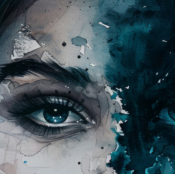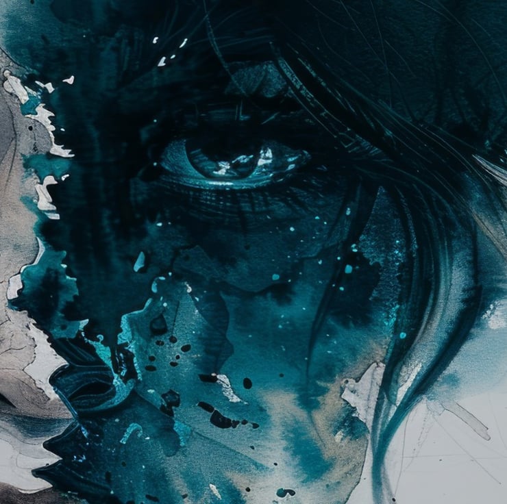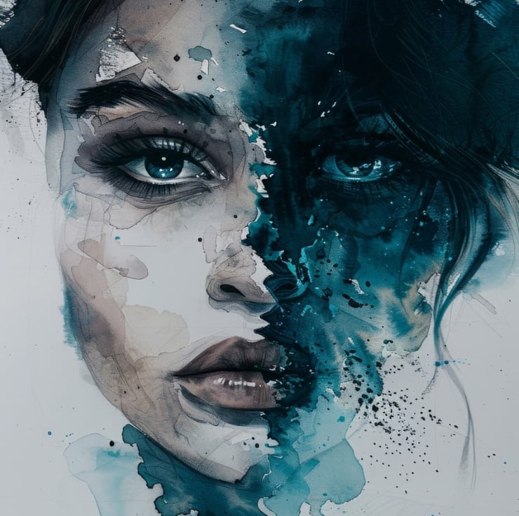 This striking watercolor portrait captures the profound concept of duality in emotions. Moreover, the artist has masterfully divided the face into two distinct halves, each representing contrasting emotional states. The left side of the face is rendered in soft, muted tones, showcasing a calm and serene expression. The delicate brushwork and subtle shading highlight the gentle features, creating a sense of peace and tranquility.