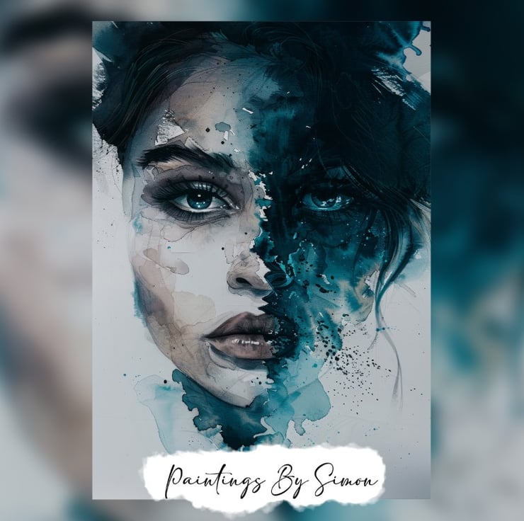 The artist’s technique of blending and splattering watercolor adds a unique texture and fluidity to the piece. Furthermore, the transition between the two halves is both seamless and striking, emphasizing the duality theme. The splashes of blue on the right side appear almost chaotic, symbolizing turmoil and complexity, while the muted tones on the left suggest simplicity and clarity.