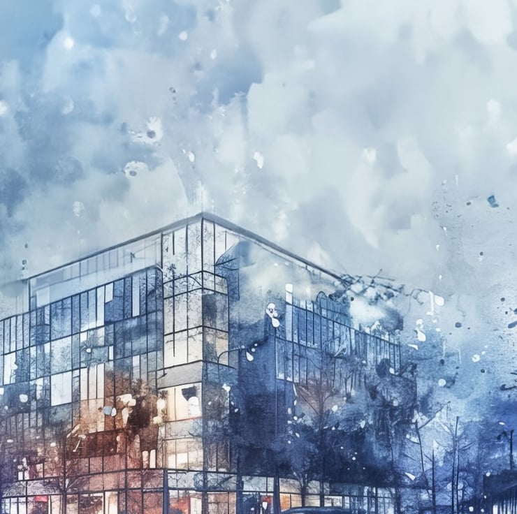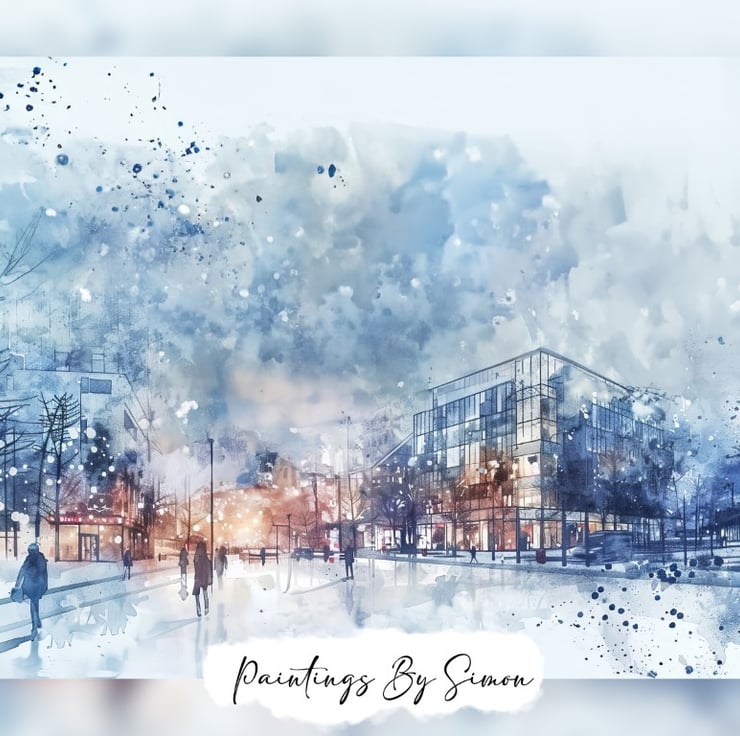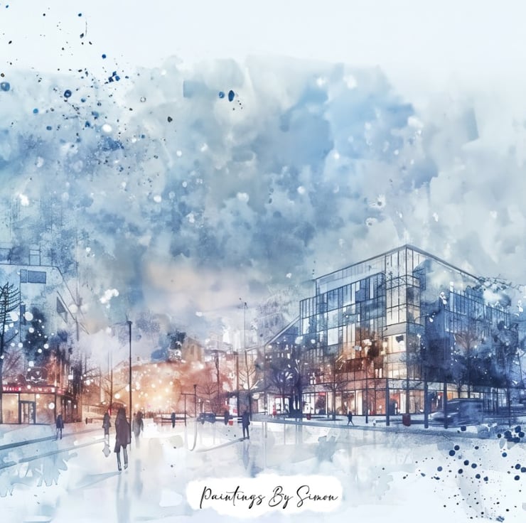 Additionally, the buildings are rendered with delicate brushwork, showcasing their modern architectural details. The large glass windows reflect the soft glow of streetlights, adding a sense of warmth and liveliness to the scene. The foreground features people walking along the snow-covered streets, their figures blurred slightly to convey movement and activity.