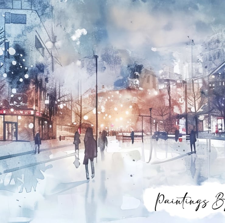 This beautiful watercolor illustration captures the enchanting atmosphere of a winter cityscape. Moreover, the scene depicts a bustling city street adorned with gently falling snowflakes. The artist has expertly used a palette of cool blues and warm oranges to create a captivating contrast between the chilly winter air and the warm glow of city lights.