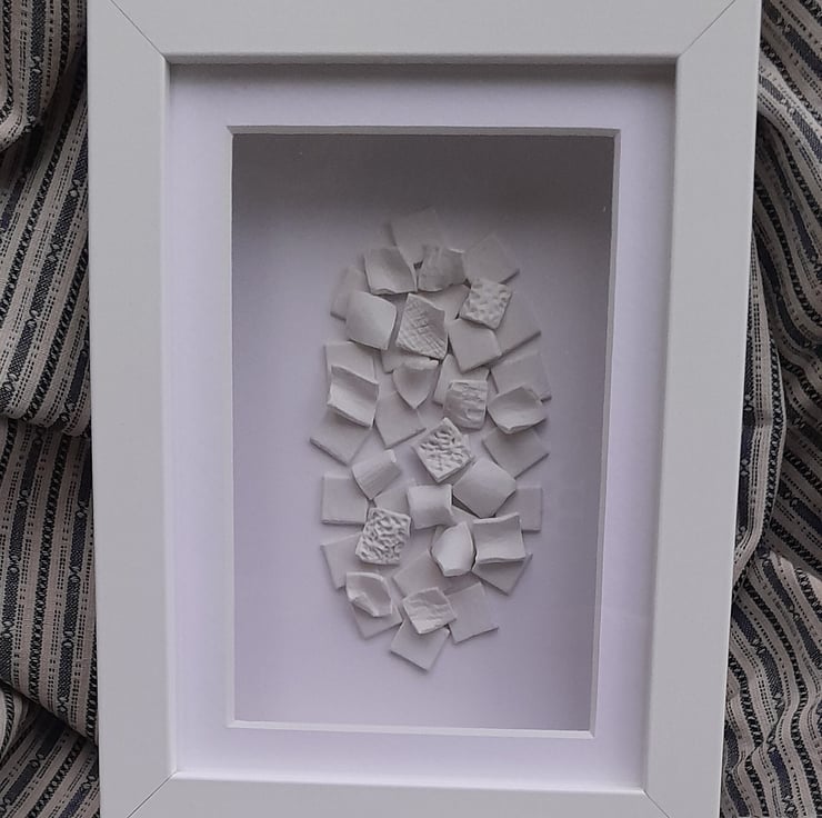 This original framed piece was created using air dried clay with each piece individually, shaped and textured by hand. The wooden frame has a perspex front, and is suitable for wall hanging, or can be freestanding. Dimensions are 20.5cm x 15.5cm x 3.5cm
