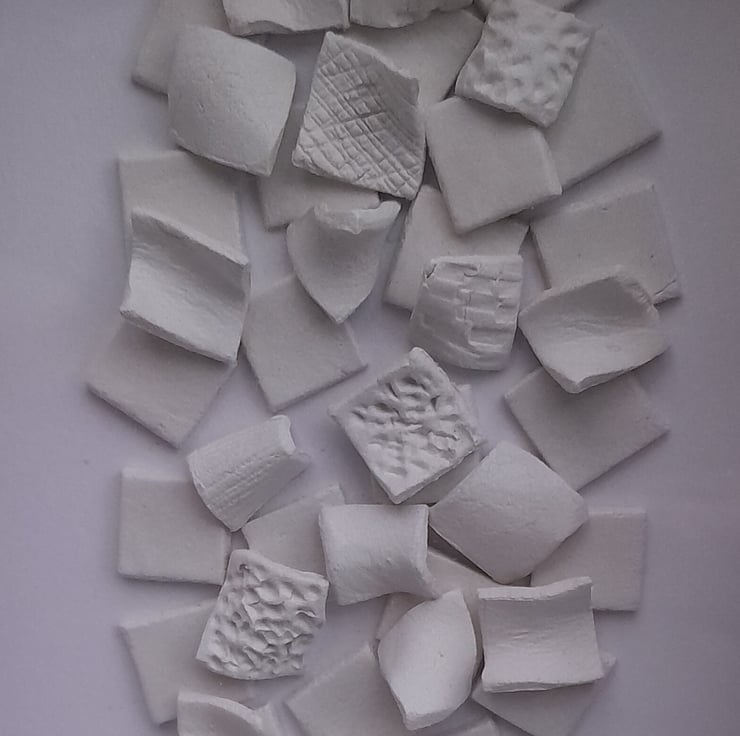 This piece is made from small squares of air drying clay, rolled, cut, and textured by hand to create a unique design.
