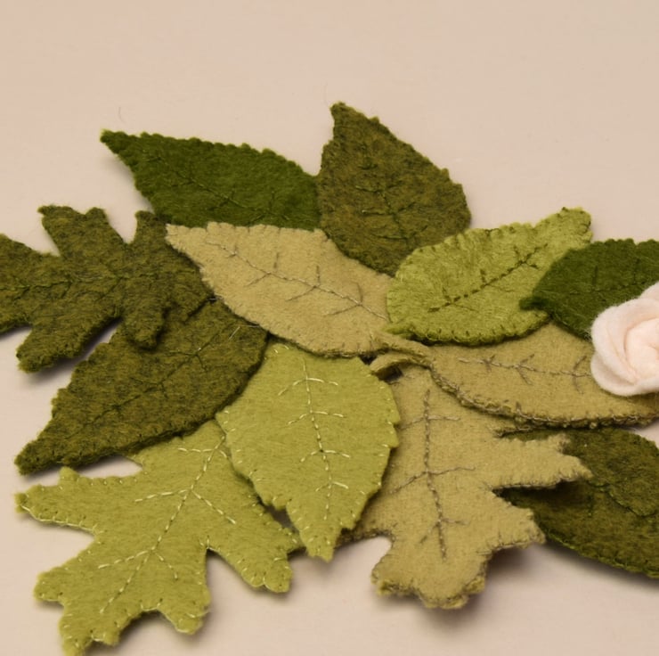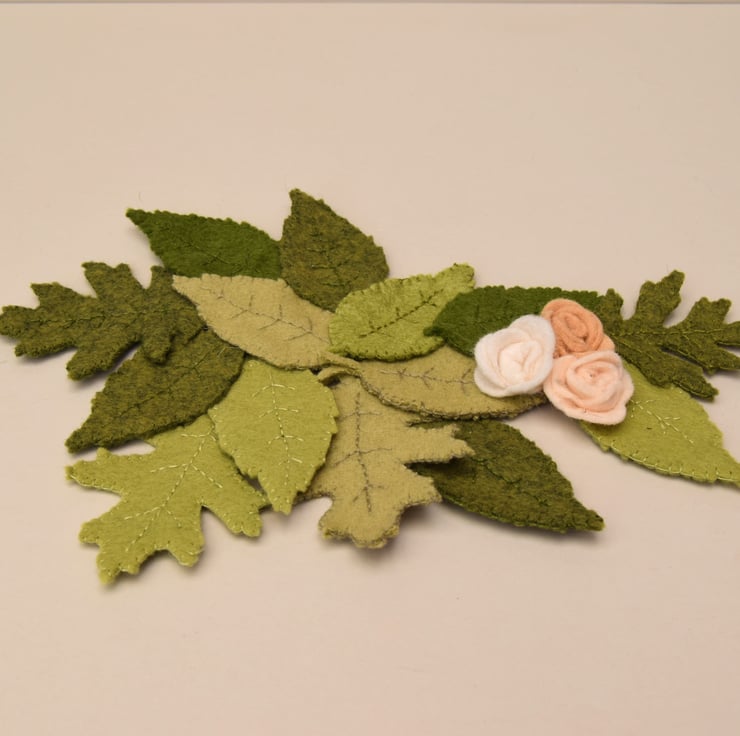 Peach Fizz sits upon a bed of fallen leaves, individually hand sewn leaves in various green wool felts have been sewn together to form a rug of leaves finished with 3 handmade roses.