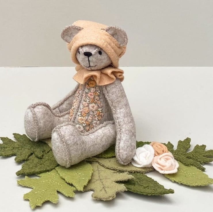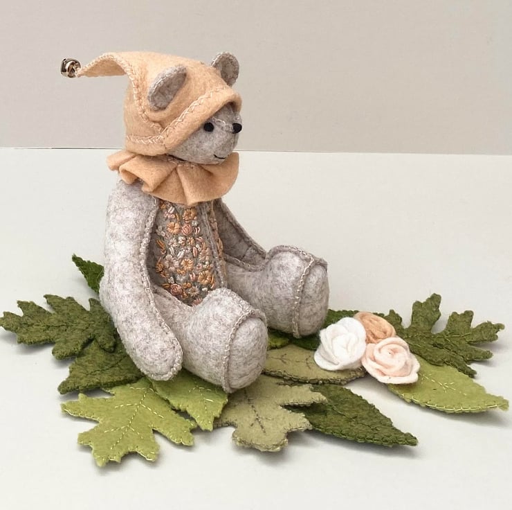Meet Peach Fizz, a small 6.75" artist bear, hand sewn with triple seams for strength, he was handmade from premium 2mm 100% wool felt in natural beige and is part of my Signature range of hand sewn bears with the seams to the right side of their bodies which forms part of their decoration.