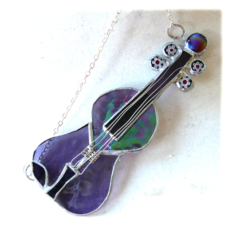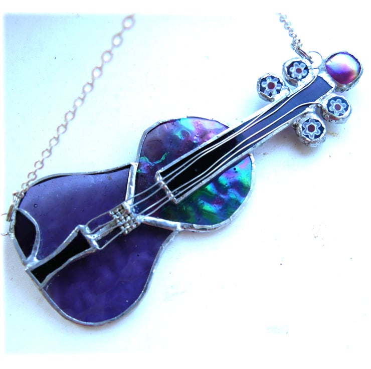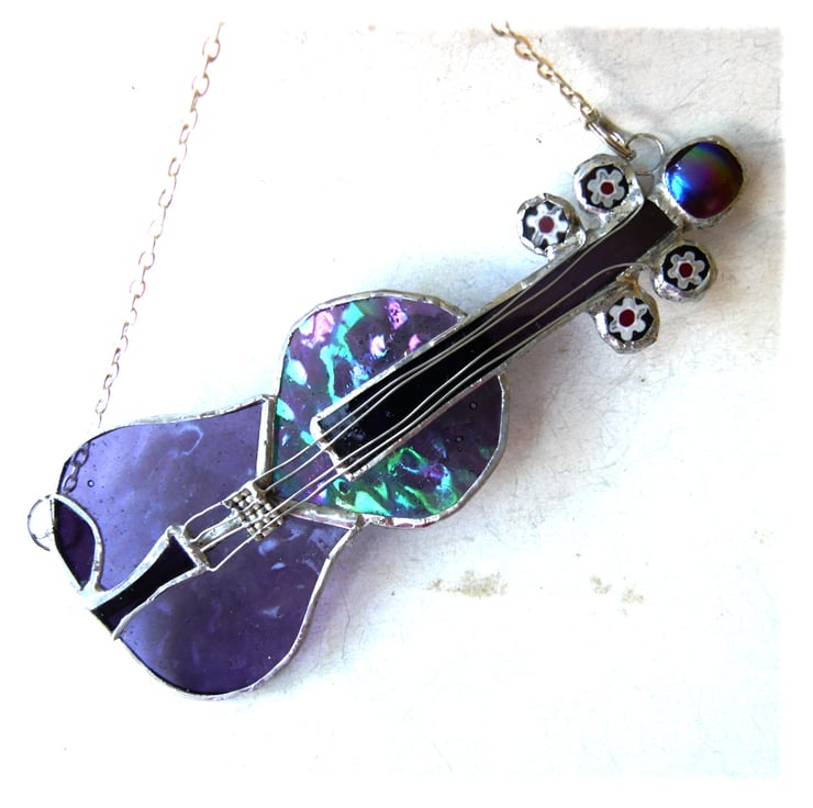 I've used a slighly deeper purple for the finger board, tail piece to give it more shine, I've made the pegs from millefiori purple beads and the 4 wires go down from the pegs, over the bridge (a silver Tibetan bead) to the tail piece. I've used a dichroic glass nugget I fused in my kiln as the scroll at the end of the neck.