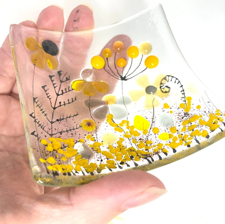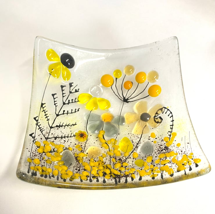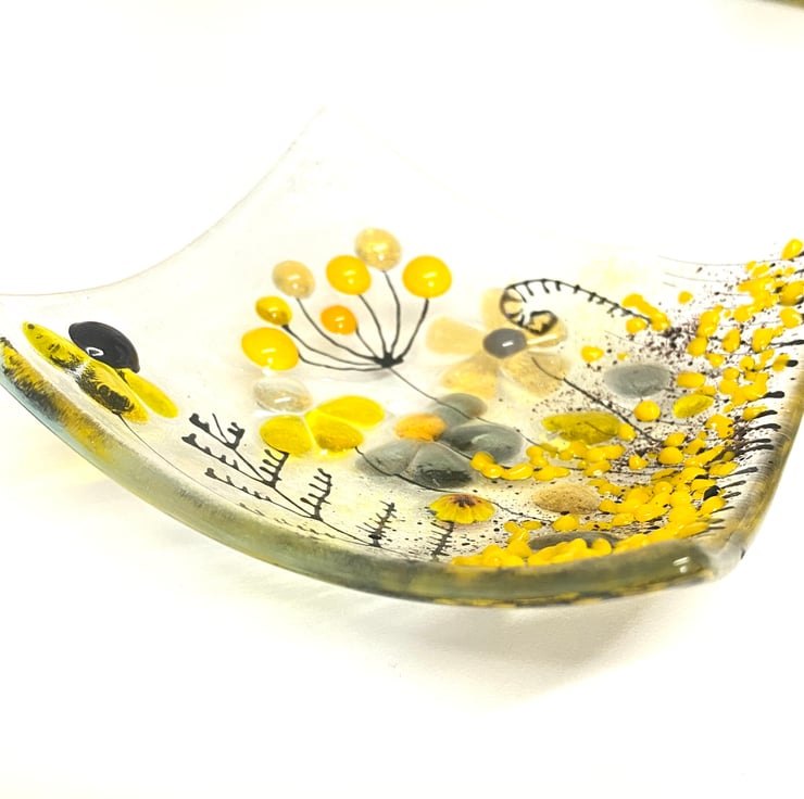 Fused glass meadows design in yellow and black . Stunning little trinket dish which is useful for keeping safe small jewellry items or purely decorative gor a dressing table , bedside cabinet or anywhere else you fancy .