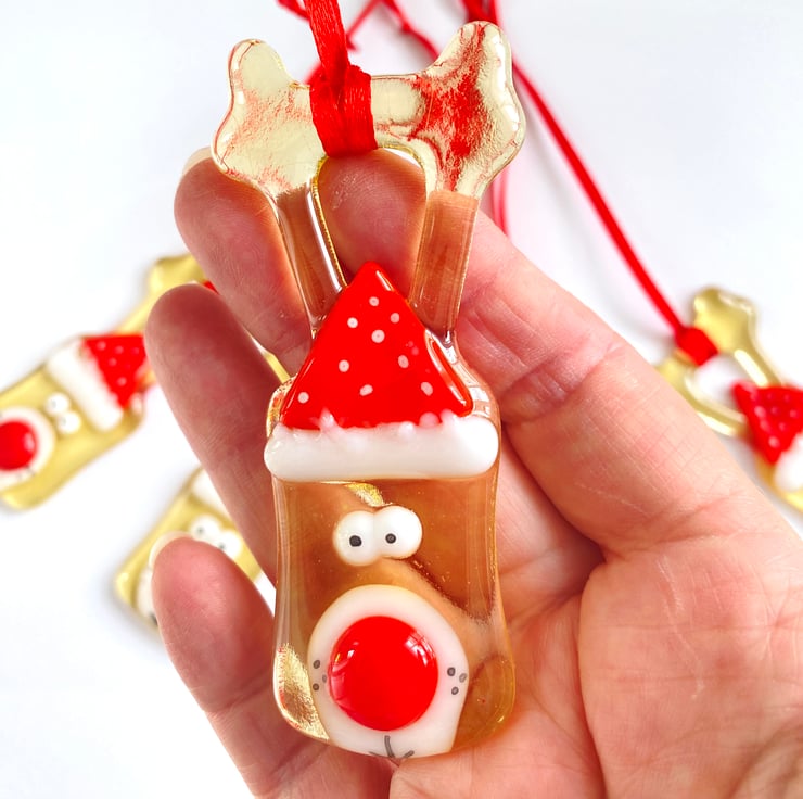Gorgeous hand crafted fused glass reindeers ready to hang on your Christmas tree . The reindeer is created using transparent light gold glass and the red Christmas hat is opaques as I’d the nose area. They are super cute and one of my best sellers. Each reindeer is created over two glass firings and are approximately 3 inches heigh .