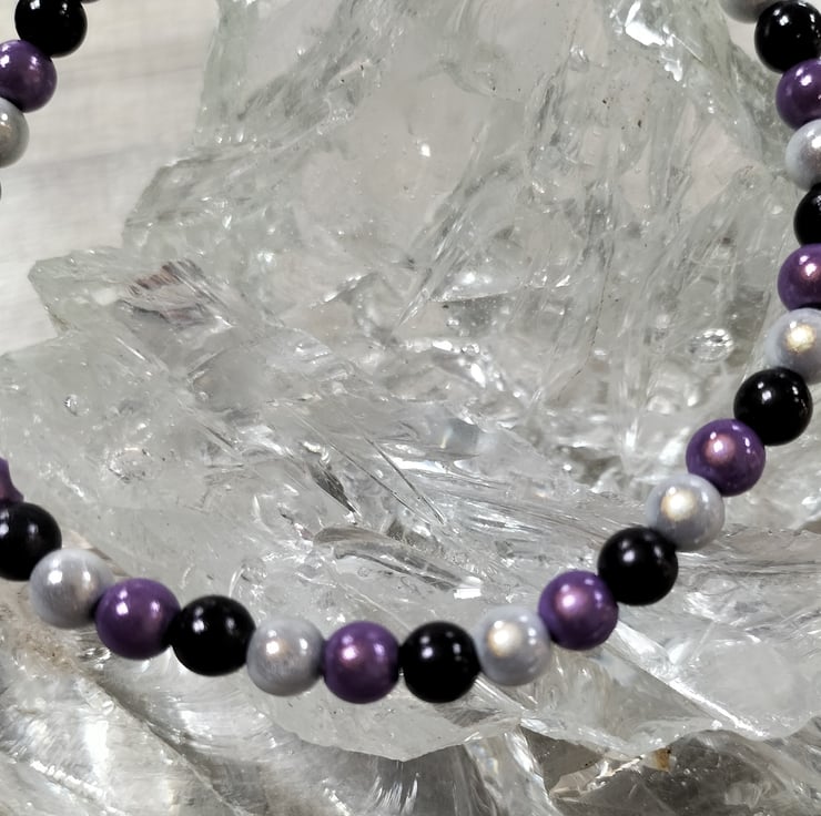 This shimmering anklet is 10.5" long with 6mm mauve, black and silver miracle beads thread onto elastic to make it easier to get on and off.