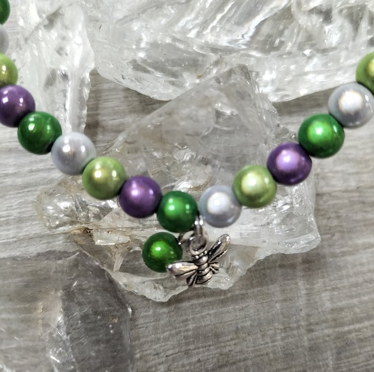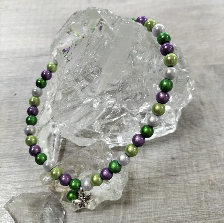 This shimmering anklet is 11.5" long with 6mm Purple, greens and silver miracle beads with a little bee thread onto elastic to make it easier to get on and off.