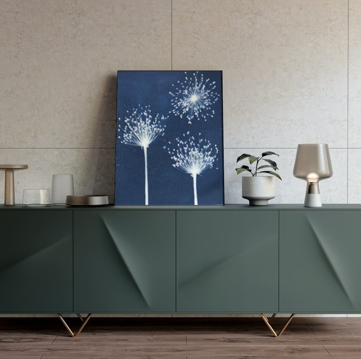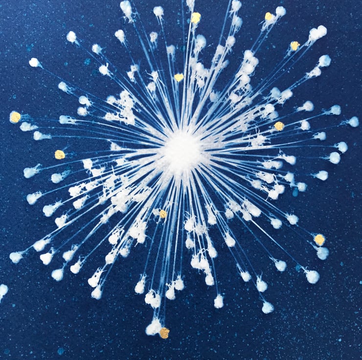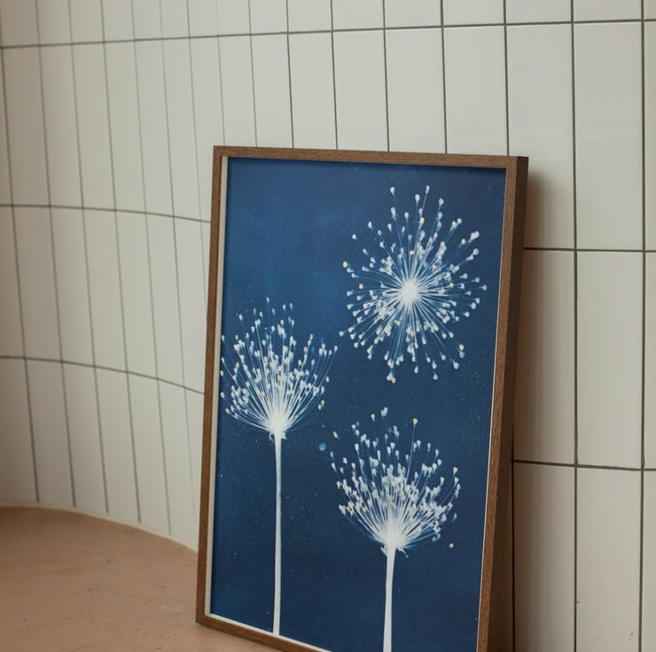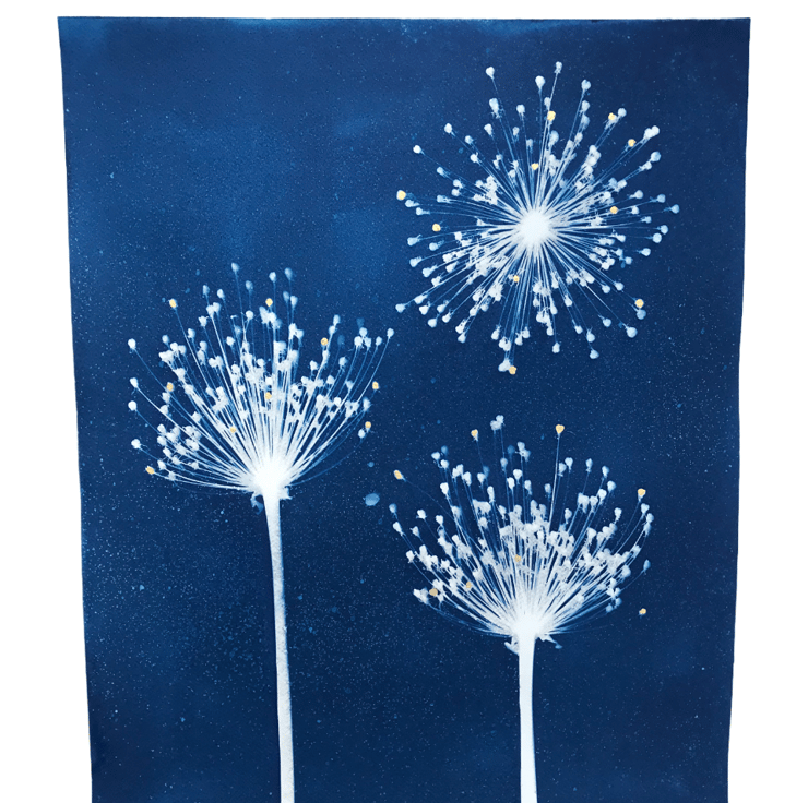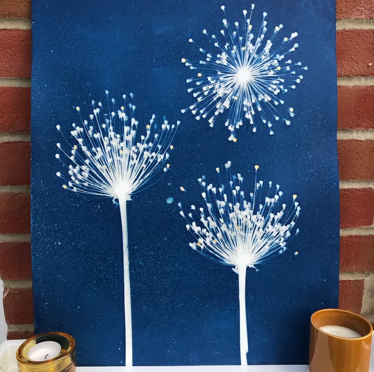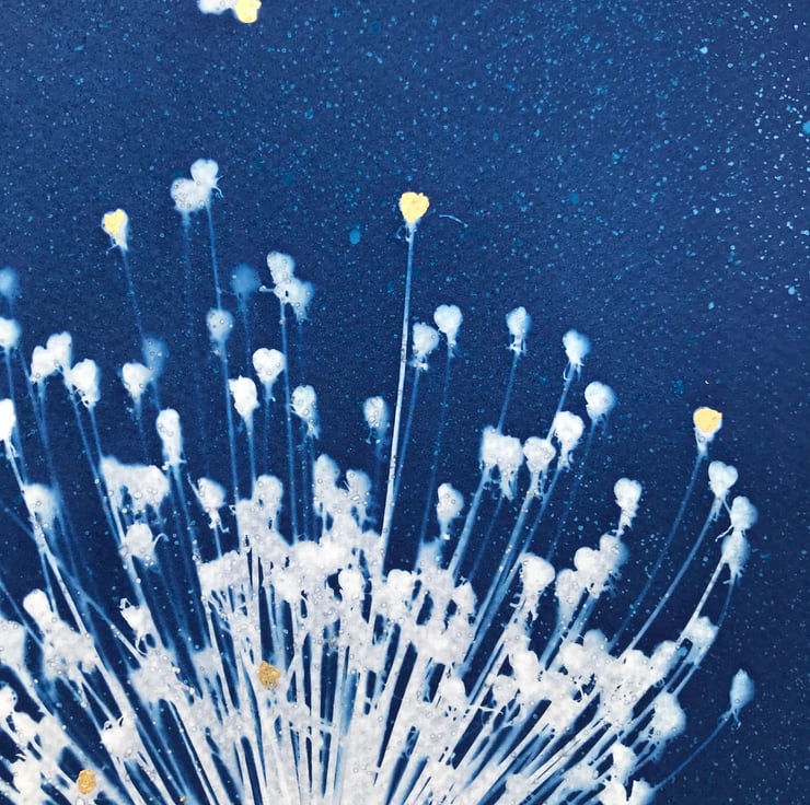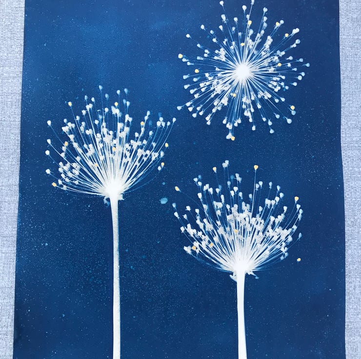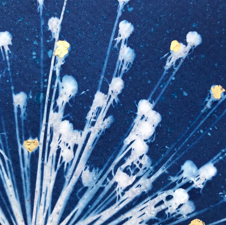 Original wall art - Art as a Gift- Prussian blue with pops of 24ct Gold leaf, helps give these amazing Allium seed heads a sense of triumph in this Photogram. The paper is also speckled by a sprinkling of salt during the Cyanotype process.