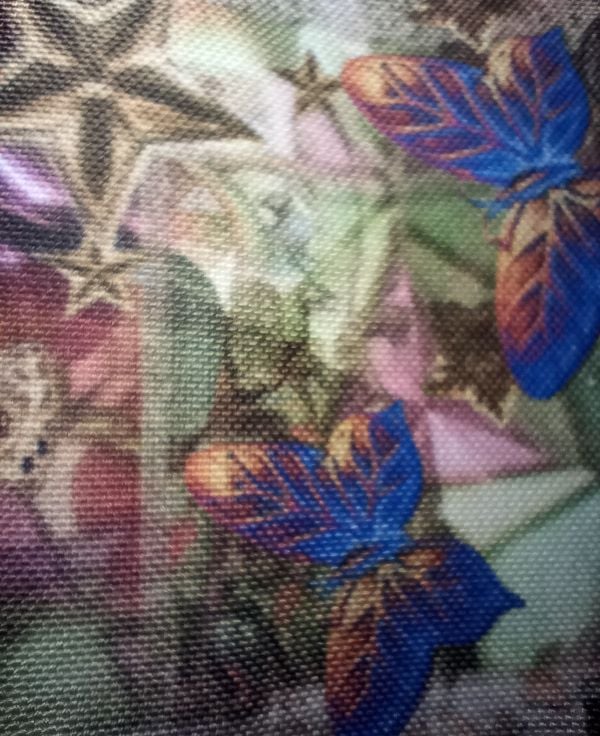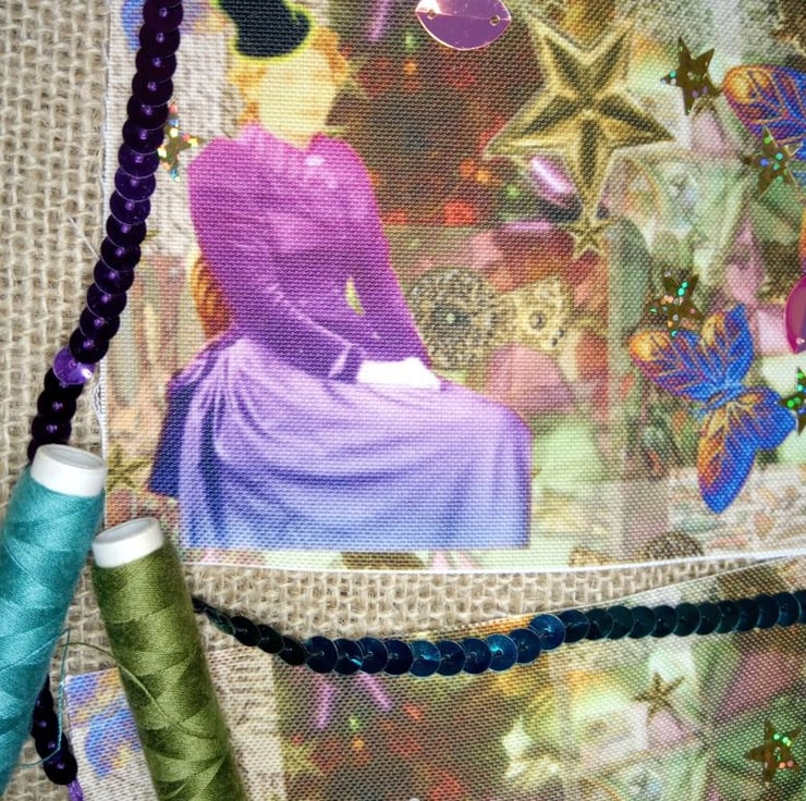 The idea is to rough cut the lady and the butterflies and add them to the plainer panel in whatever way you like, sew them down using a sewing machine, and stitching, embroidery, add your own beads, scrap fabric and old embellishments you already have. Perfect for textile artists.