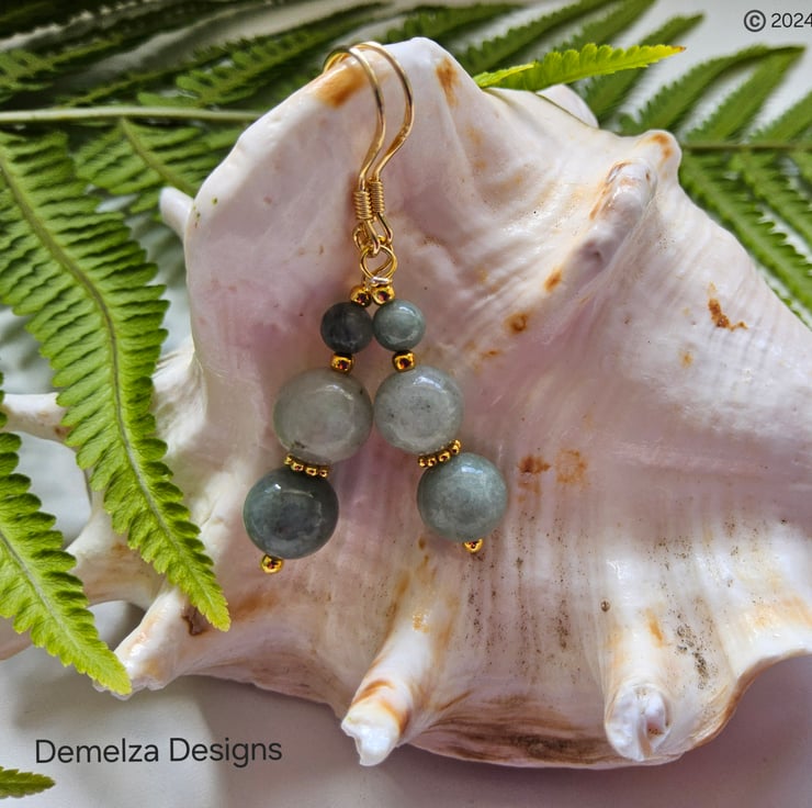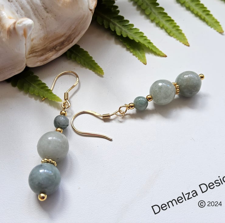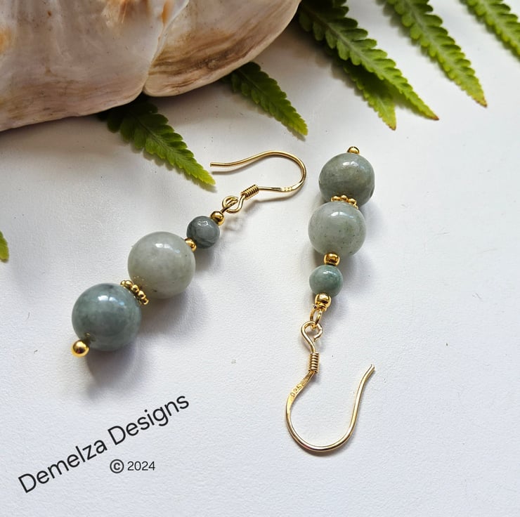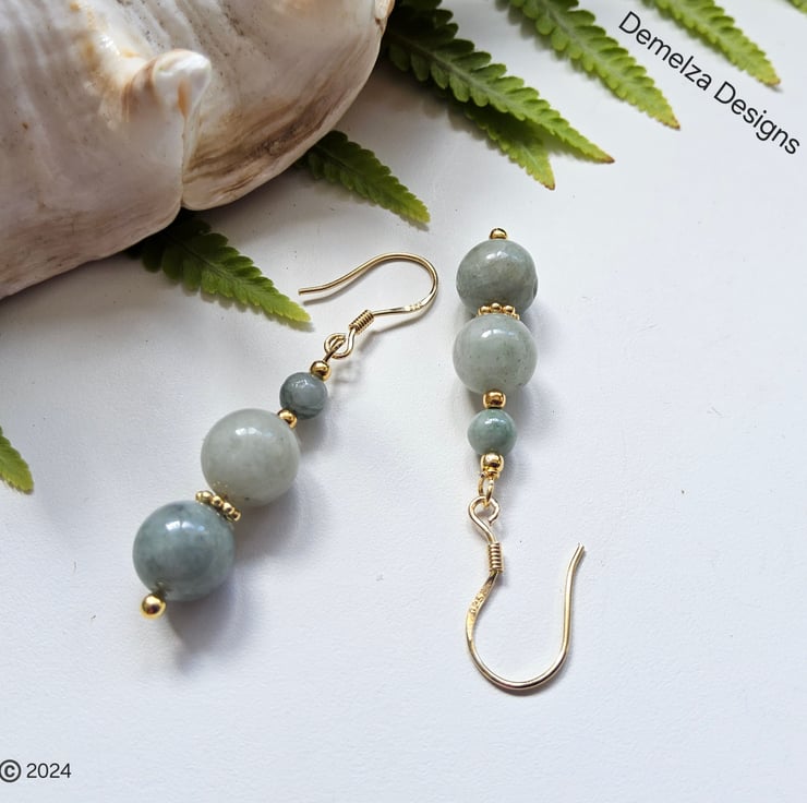 A beautiful pair of earrings designed and hand crafted in Cornwall using quality Burmese adeite smooth 8mm and 4mm polished round gemstones. Jadeite is more expensive and prized by collectors for it's subtle light green hues.