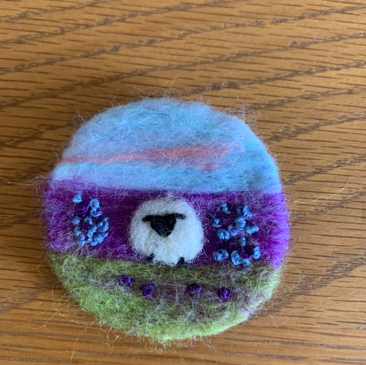 The white fluffy sheep stands amongst purple heather. A touch if hand embroidery gives added texture and luxury. These brooches are suitable to wear on a coat scarf wrap or even your favourite jumper.
