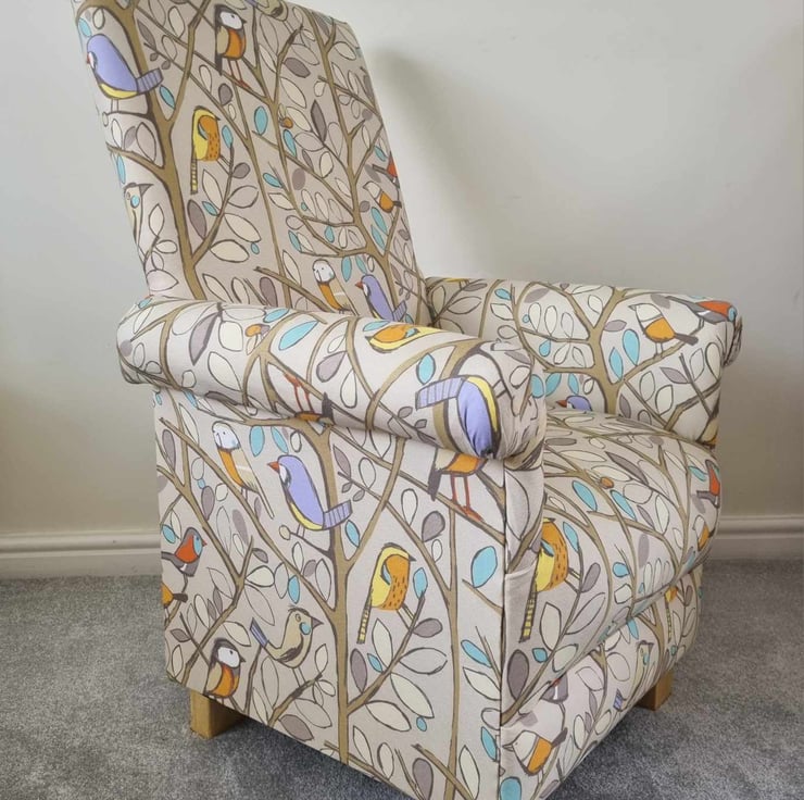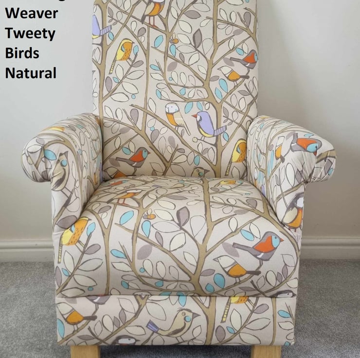 This is a fully assembled, handcrafted ADULT'S chair, which has been made myself. I am a professional upholsterer with over 33 year’s experience, and have made this sturdy little chair using Edinburgh Weavers Tweety Birds in Natural fabric.