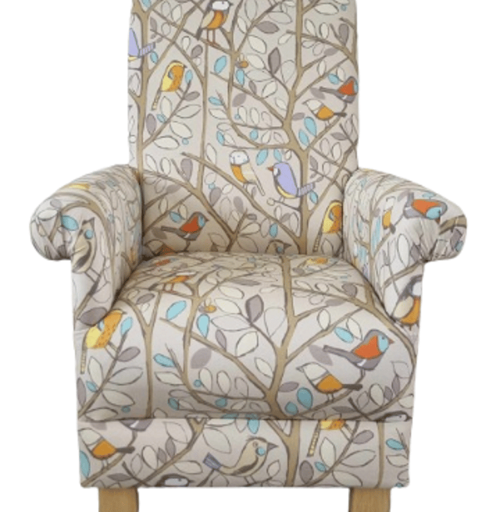 This lovely adult's armchair measures approximately 38 inches in height, by 26 inches wide and will look gorgeous in any room, and is a real accent piece of furniture. It has a wooden frame and has a fire retardant interliner, which makes it compliant with UK fire regulations. It is then upholstered entirely with this gorgeous fabric, and has solid wooden feet.