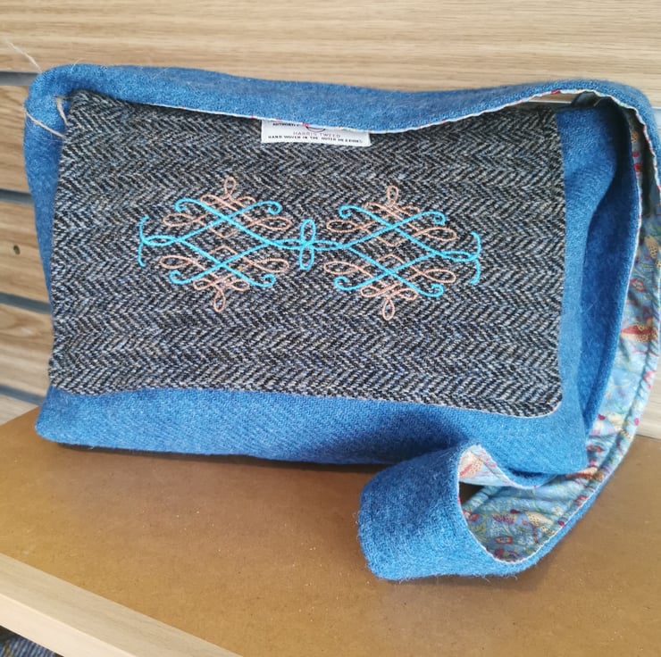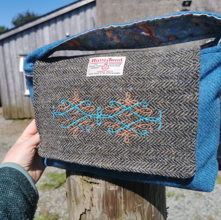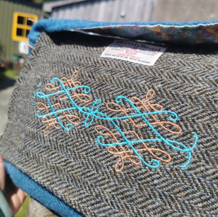 This bag is in the stunning Skye blue body and herringbone lid. With a lovely embroidered celtic knot