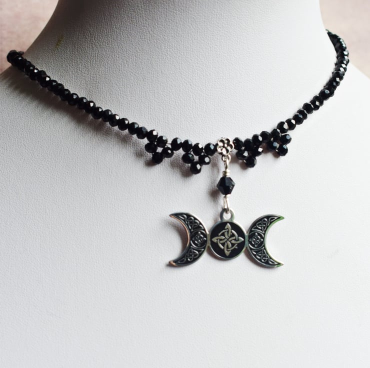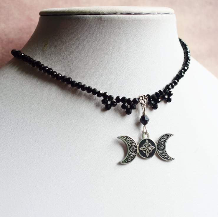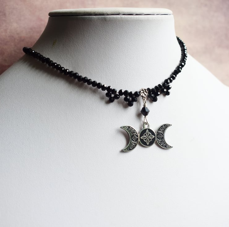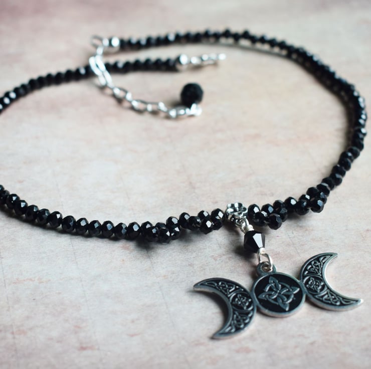 The pendant is a wonderfully detailed stainless steel pendant with Celtic crosses on all three moon phases, the maiden, mother and crone. It hangs between 4 beaded droplets and the rest of the necklace is made with tiny faceted black glass beads.