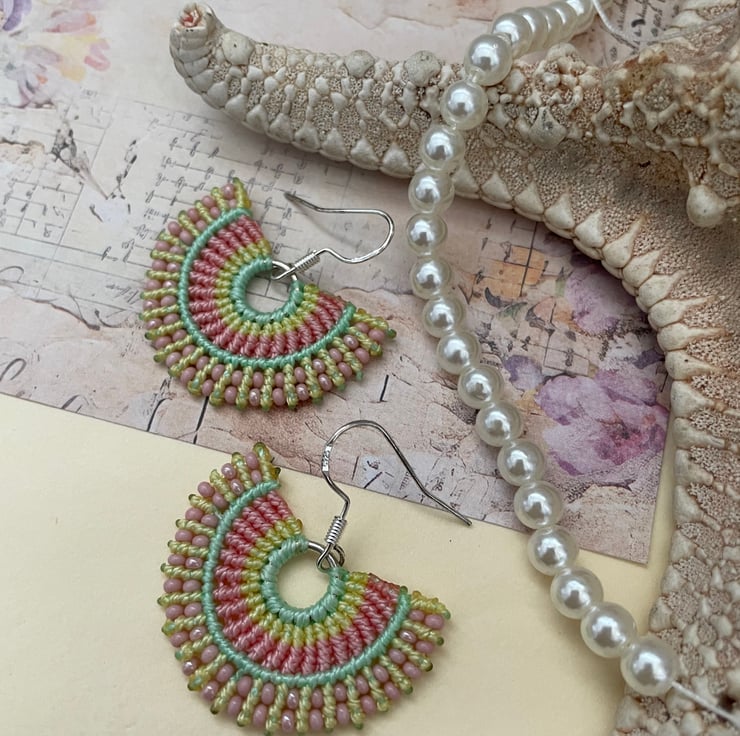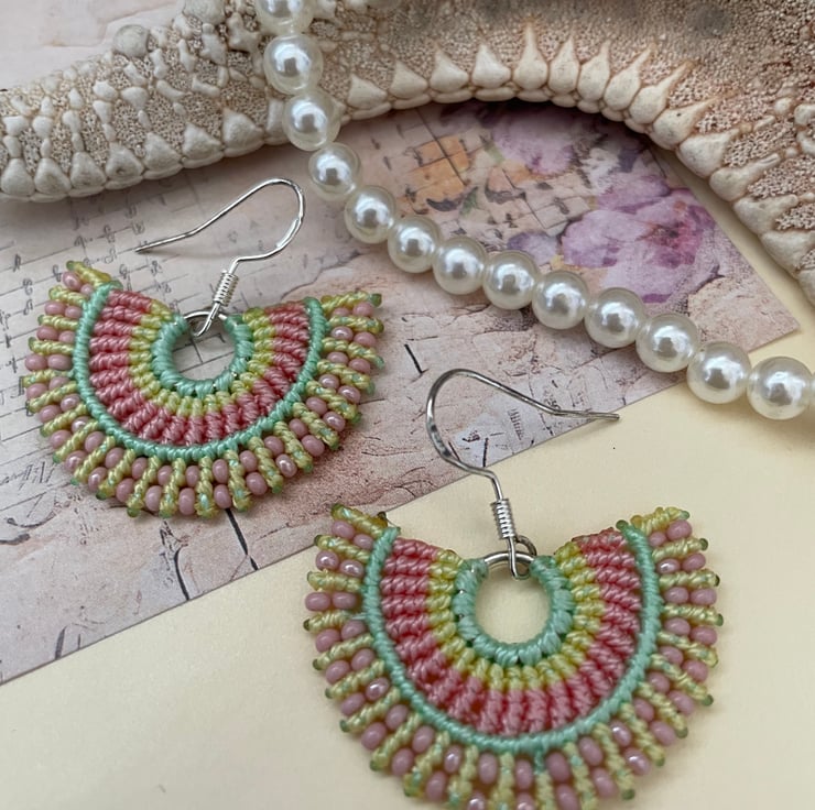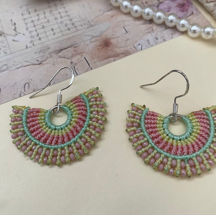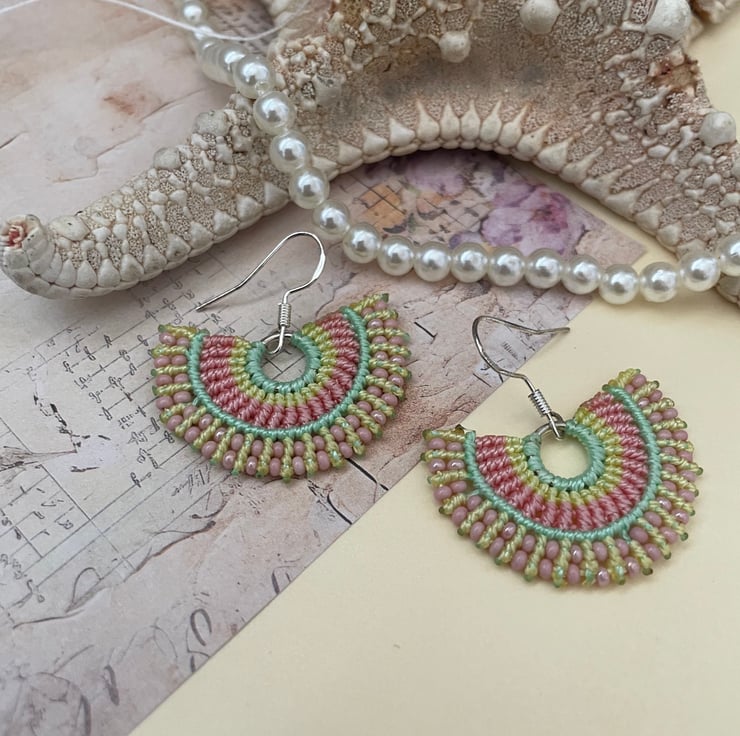 I have created these earrings using the intricate knotting art of macrame, using extremely strong C Lon thread in pretty shades of blue and pale pink