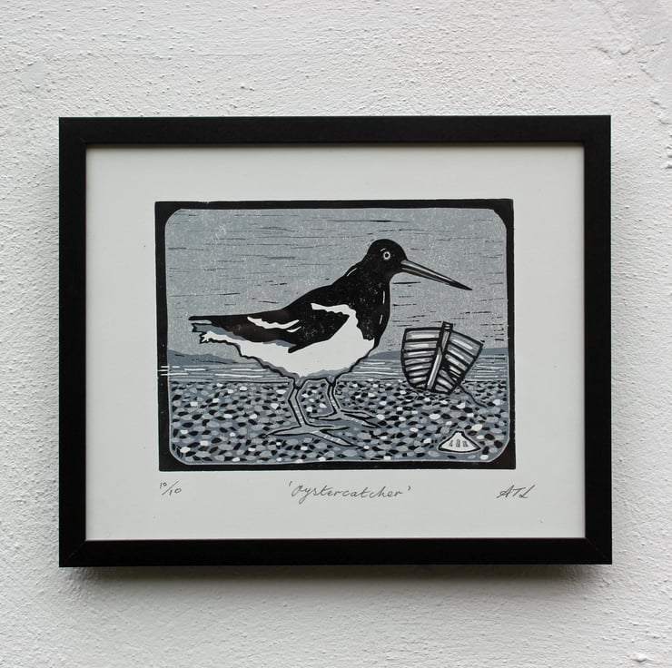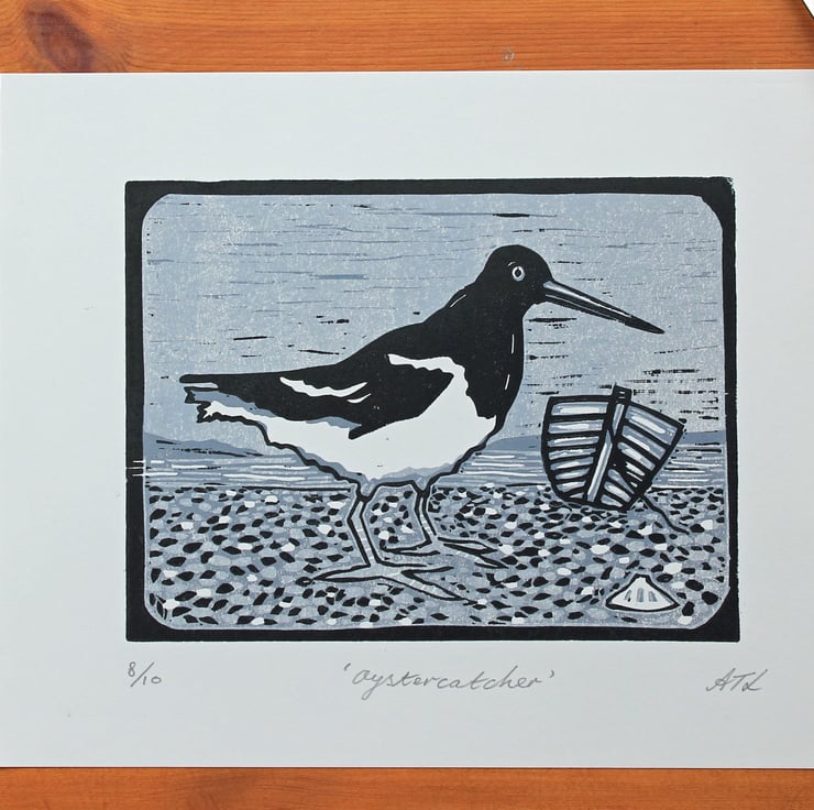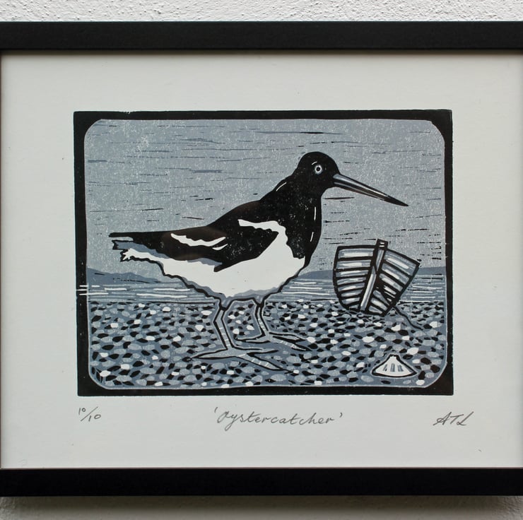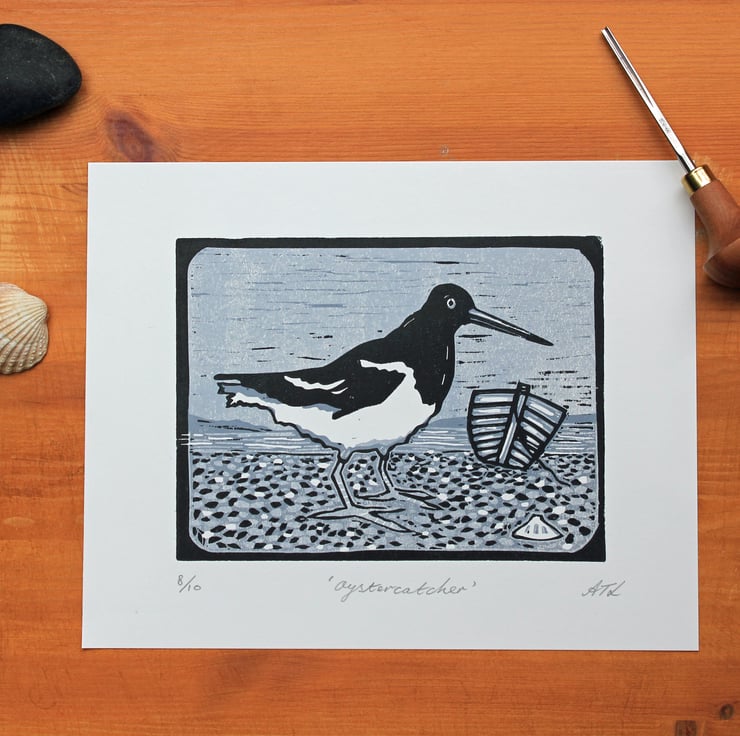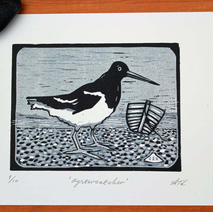 An Oystercatcher reduction lino print in two colours limited edition of 10.