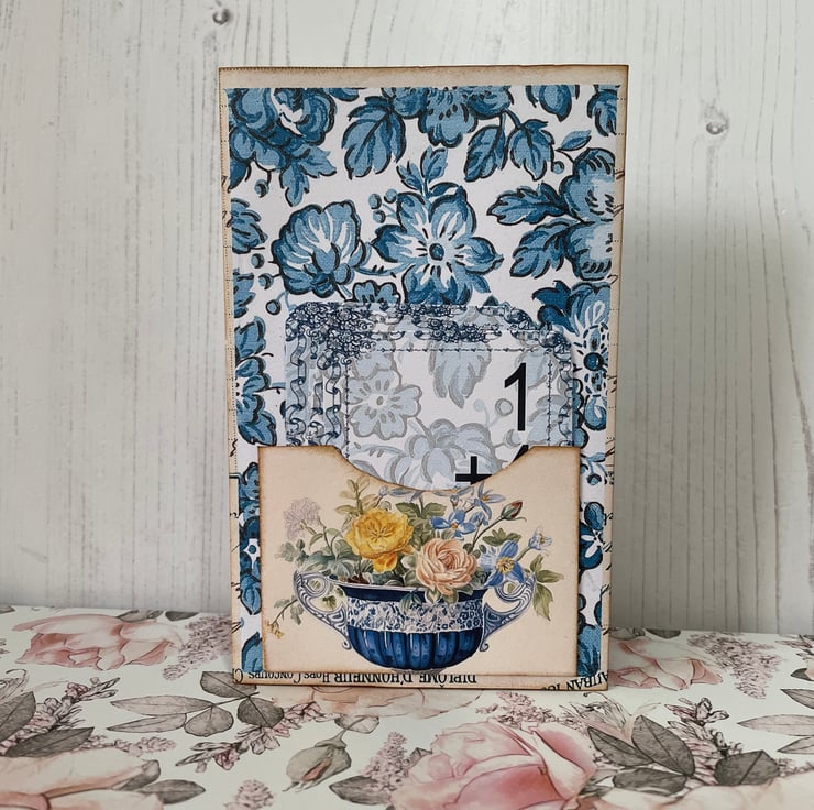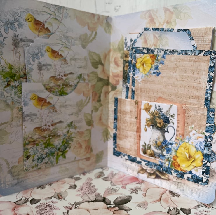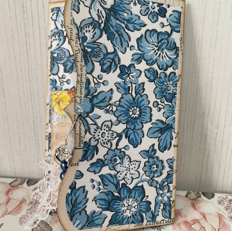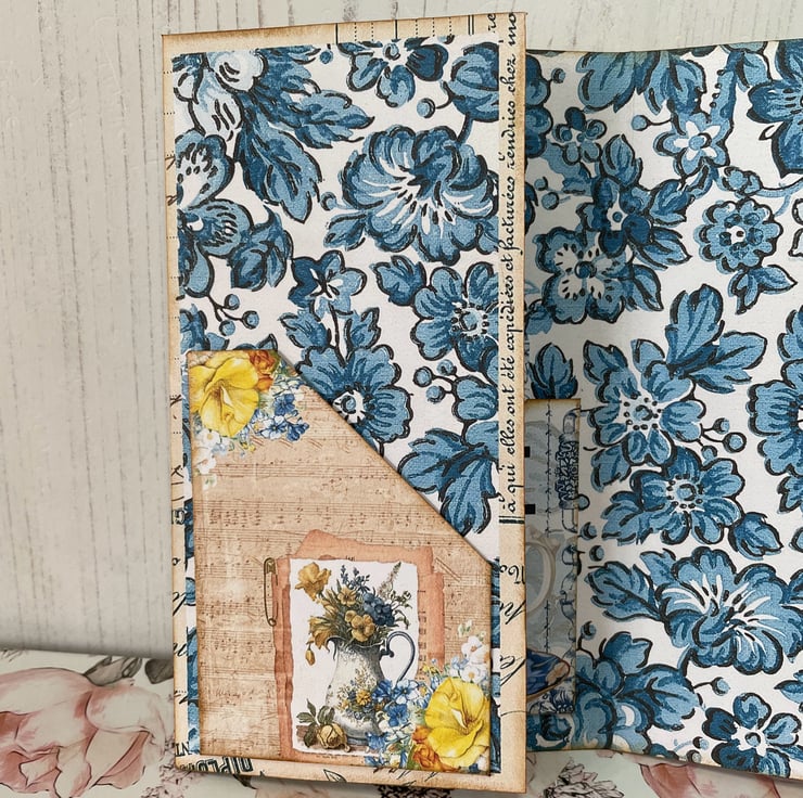 A5 folder with 2 pockets, 2 tags, 2 journal cards, 1 A4 sheet of printed paper folded. Mini flip folder with 4 pockets and Journalling cards. Teapot charm, beads and lace on a bulb pin.