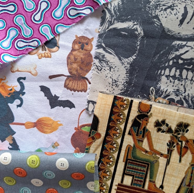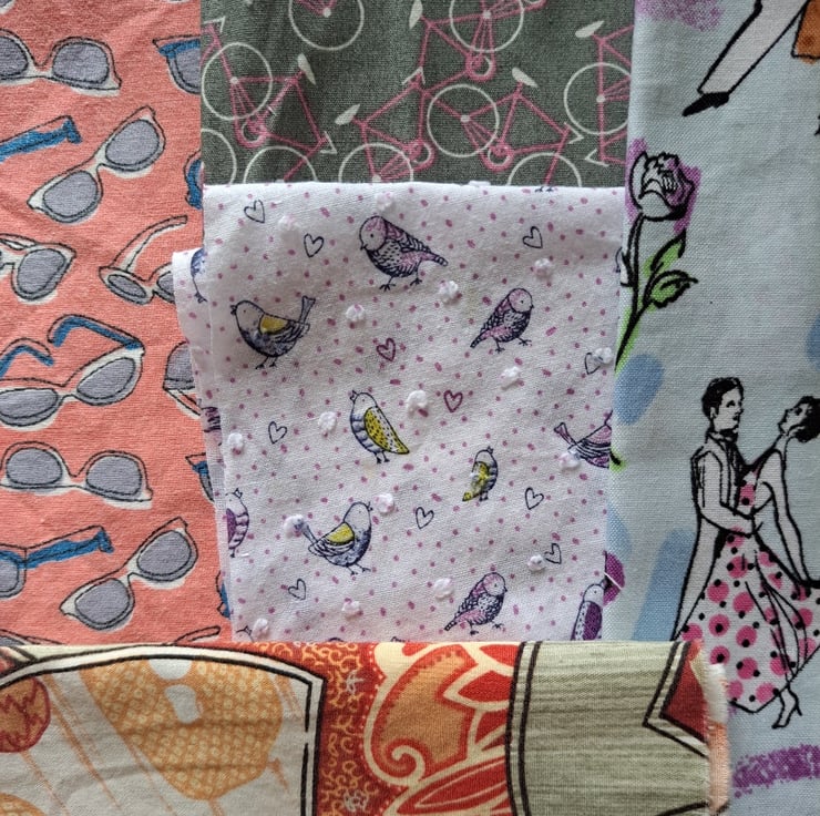 Budgies, bikes and ballroom dancers... this quirky little bundle is made up of 14 assorted pieces of mostly cotton fabric with talking point designs, from Egyptian pharaohs to pairs of glasses. The largest piece is approximately 30cm squared.
