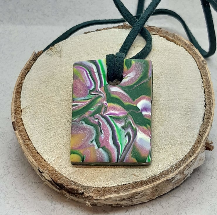 This rectangular multi coloured pendant measures 46mm deep x 29.3mm across and can be worn either way round.