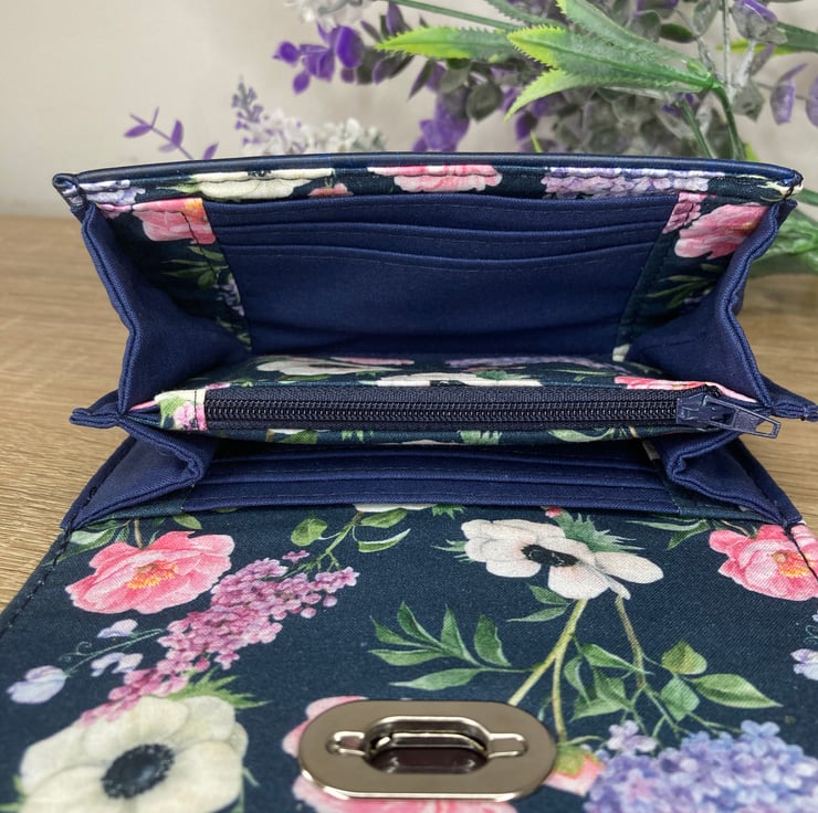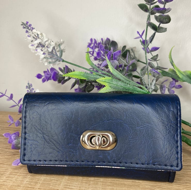 Handmade Accordion wallet, made from a beautiful blue Leatherette, with navy / floral cotton lining inside. Secured with a twist-lock closure, this wallet also features 6 card slots, 2 of which have enough space for folded notes, and a zipped coin purse in the centre.