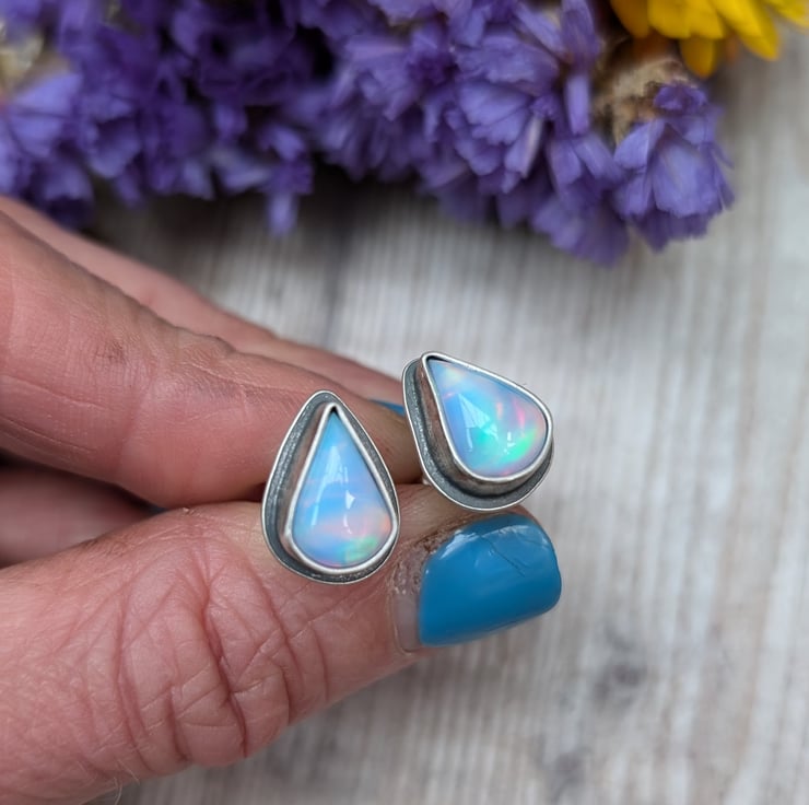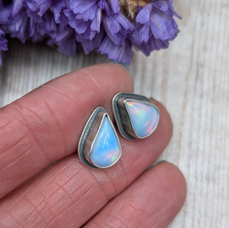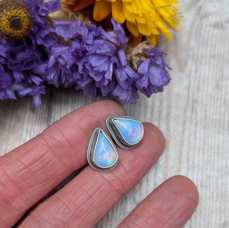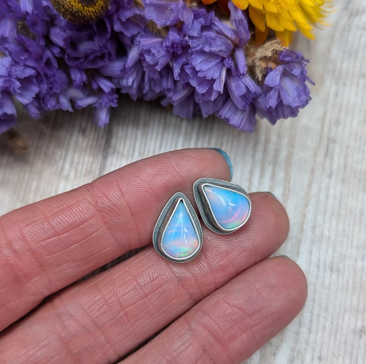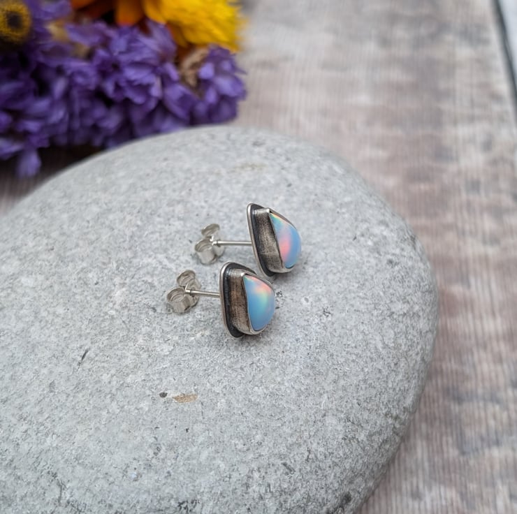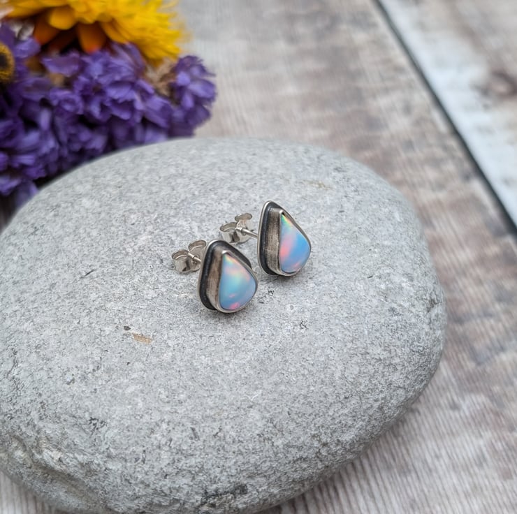 These stunning teardrop stud earrings feature captivating Aurora opals with a mesmerizing play of colours, set in oxidised sterling silver for a modern look. Handmade in Bristol, UK, using recycled silver, these one-of-a-kind studs are perfect for those who love unique, eye-catching jewellery. The opals shift between shades of blue, pink, and green, making each earring truly unique.