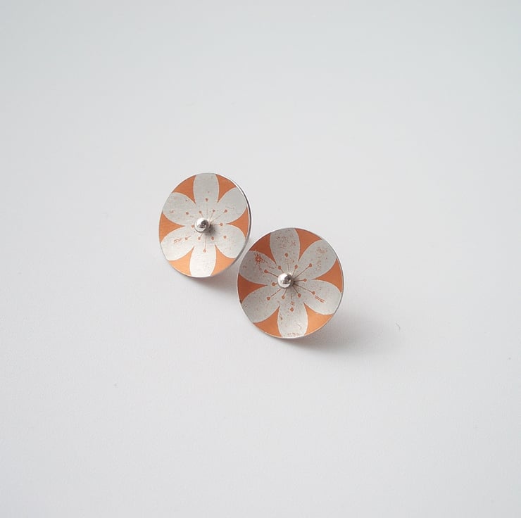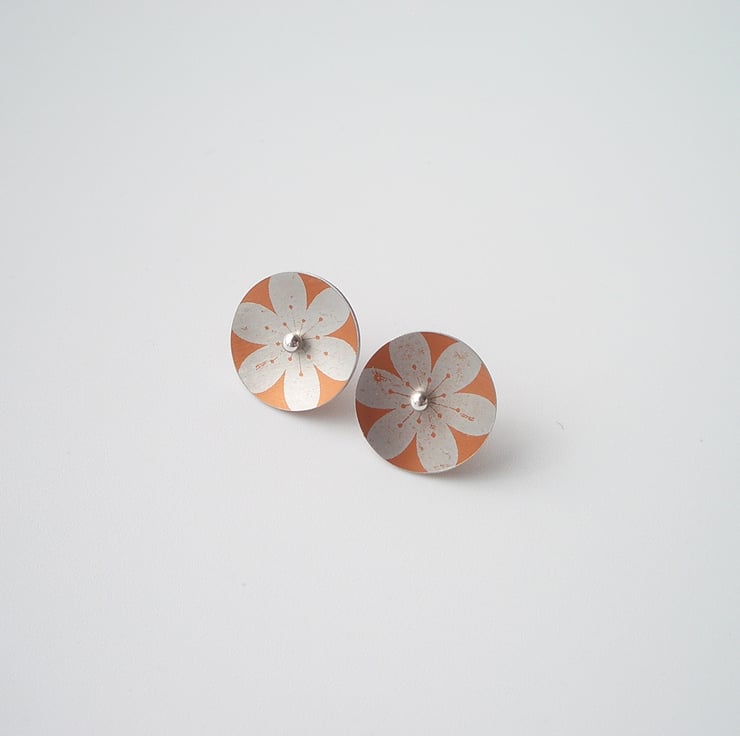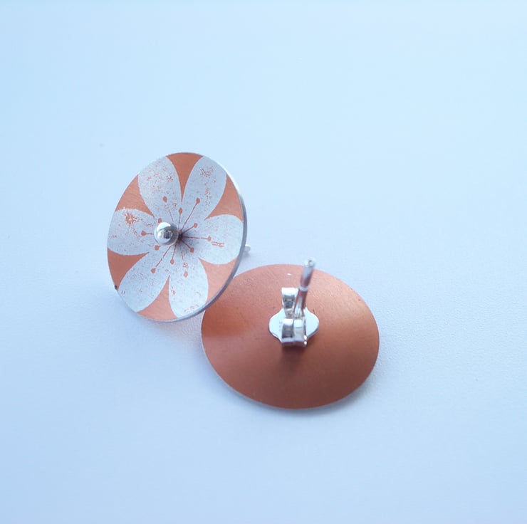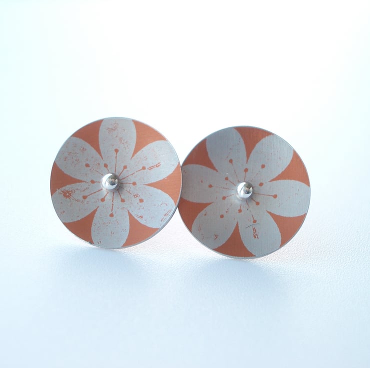 These orange and silver flower circle studs are made from aluminium which I have dyed and printed with a flower design. I seal in the dye which makes the colour a permanent part of the metal and the saw out the circle shape by hand, finally doming it inwards a little so that they catch the light when worn. Aluminium can't be soldered so the studs are loose. The circle is fed on to a sterling silver post which when worn holds the circle in place on the earlobe by pressure from the butterfly behind. The silver ball studs can be worn on their own too.