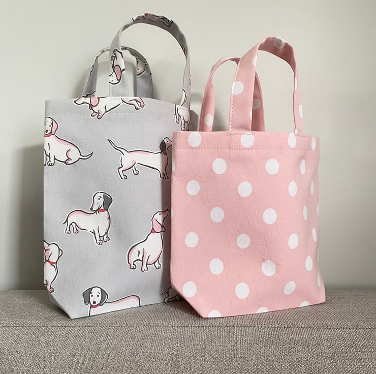 Tote style gift bags with boxed corners and handy ribbon tie for concealing gifts within. These bags are upcycled from pre loved home linens and soft furnishings. Mostly cotton/polyester mix fabric strengthened with fusible interfacing they are perfect for gift giving or storing lightweight items such as hair accessories. If you would like a bag for heavy use, eg. as a shopping bag, please see my lined tote bags or get in touch with your ideas. Lovingly wrapped and sent in recyclable or reusable packaging.