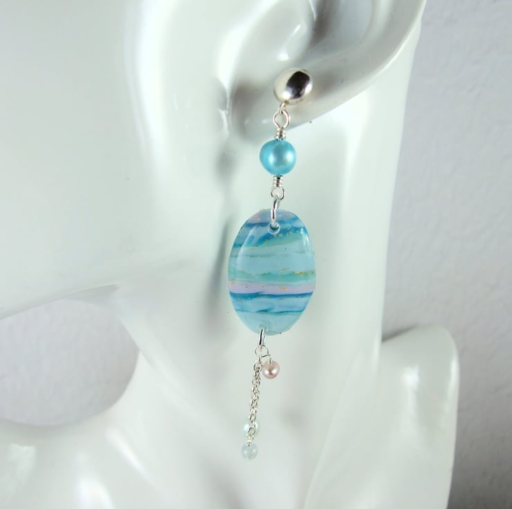 I started with the polymer clay, cutting and layering to create a marbled effect using translucent clays with inks and some gold leaf. Once the clay was cured I coated with resin for a high gloss finish and to protect the clay. The top of the earrings is a sterling silver button stud fitting joined to the dropper with a pretty turquoise pearl, securely wire wrapped together and at the bottom are blue and lilac pearls suspended from delicate silver chains for movement.