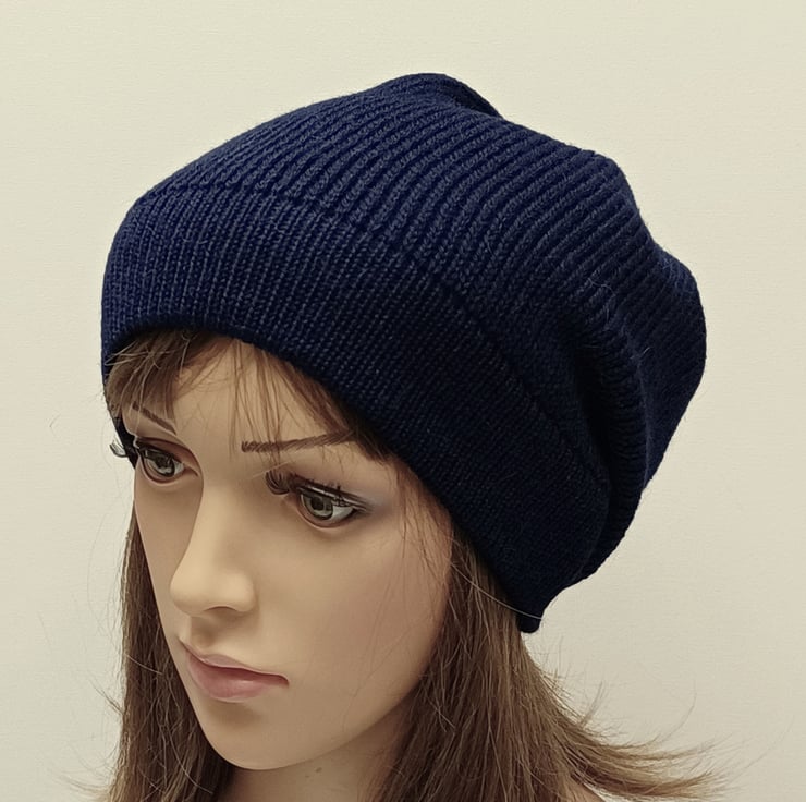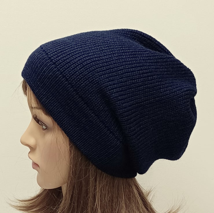 Handmade navy blue baggy beanie, knitted alpaca blend beanie hat, slouchy beanie.