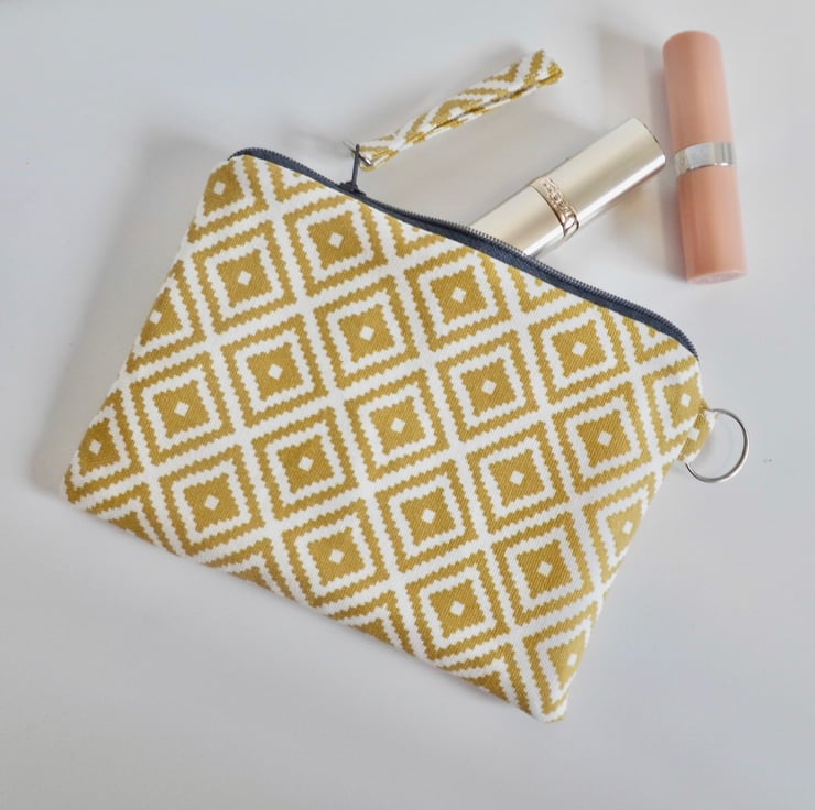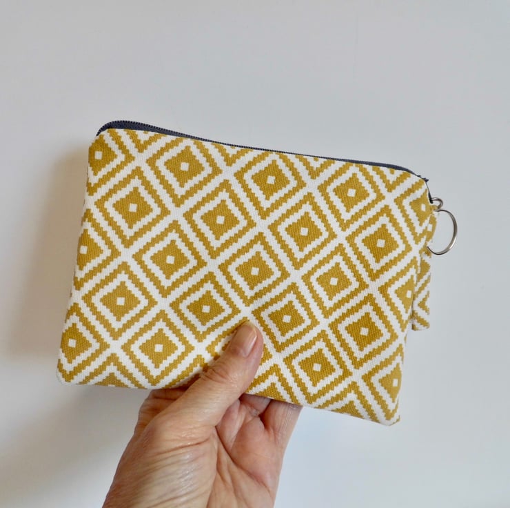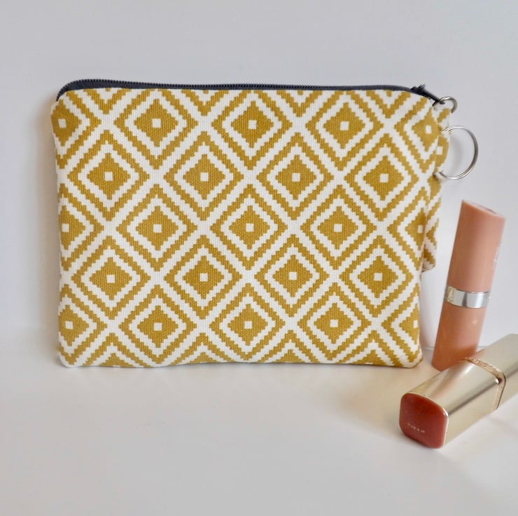 This make up purse is made using a furnishing weight cotton with a geometric print in yellow ochre. Lined with plain ivory cotton fabric, which was ready backed with a soft fleece to give the purse some body and a quality feel.