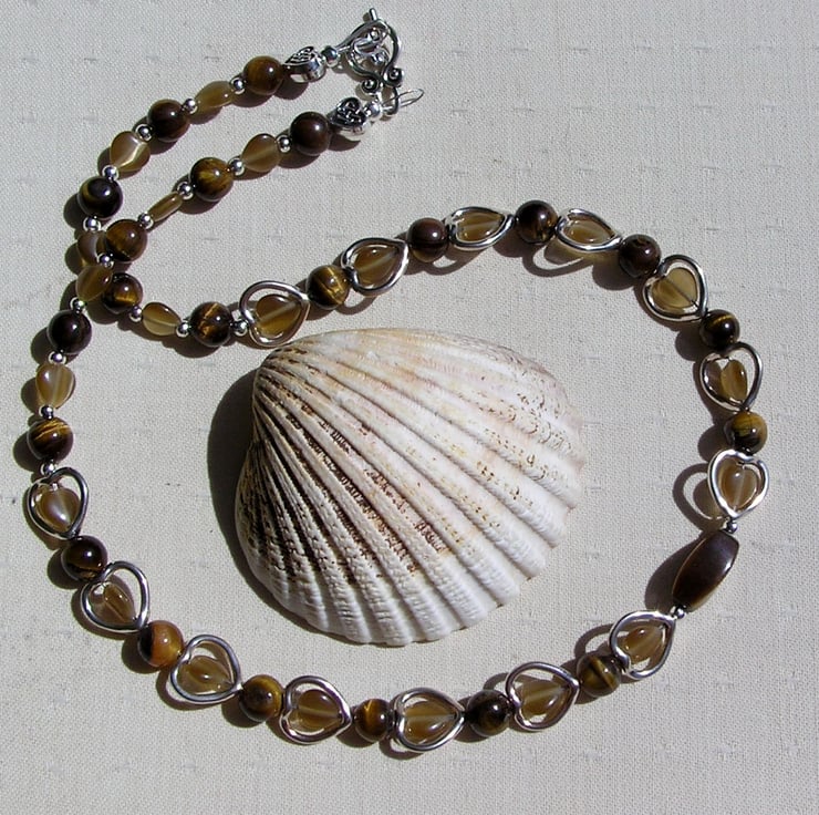 This Stunning Necklace is made from alternating Gold Tiger Eye round beads and Heart shaped Coffee Brown Cat’s Eye beads… which are suspended inside Tibetan Silver Heart Frames - with a Tibetan Silver Celtic Heart at each end A Sumptuous look that will look stunning for either the casual look or wear it with something more Elegant for a Special Evening out