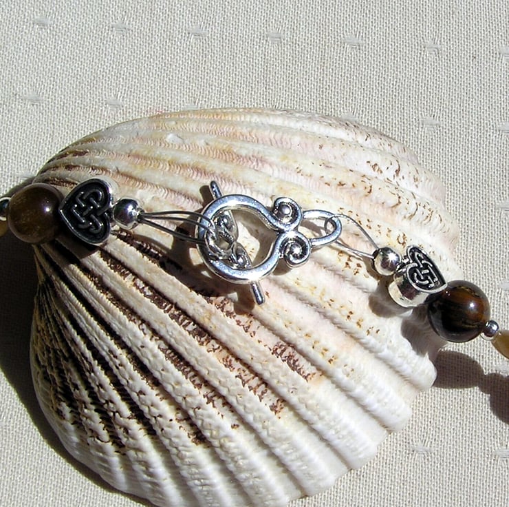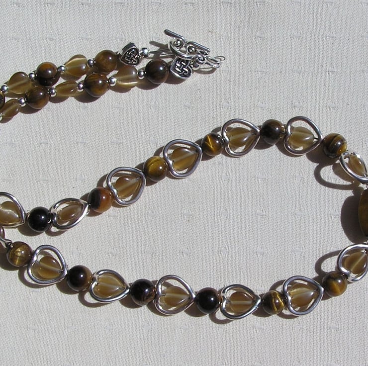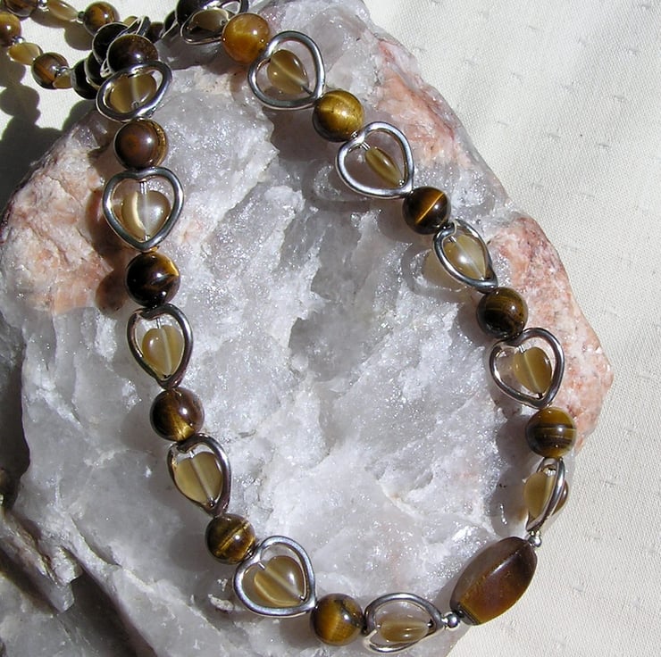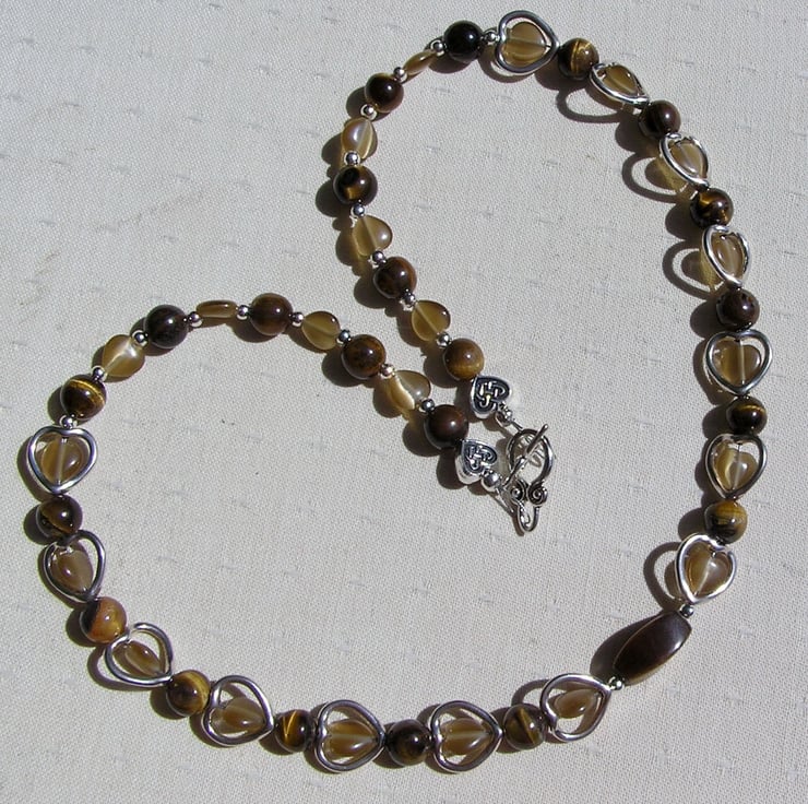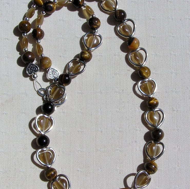This Stunning Necklace is made from alternating Gold Tiger Eye round beads and Heart shaped Coffee Brown Cat’s Eye beads… which are suspended inside Tibetan Silver Heart Frames - with a Tibetan Silver Celtic Heart at each end A Sumptuous look that will look stunning for either the casual look or wear it with something more Elegant for a Special Evening out
