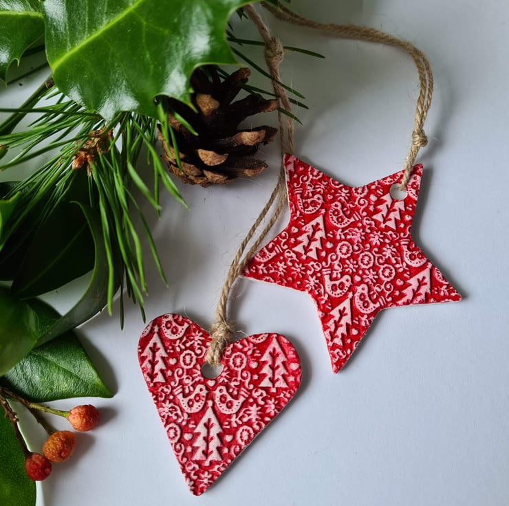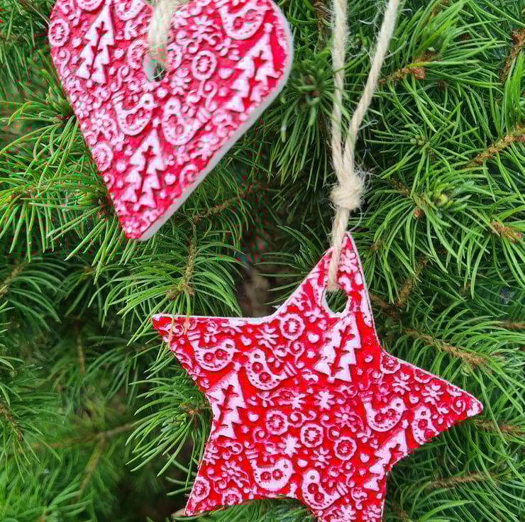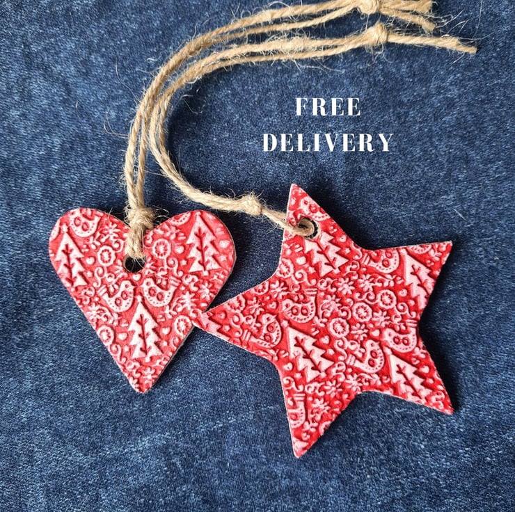 Each decoration is individually made so will differ slightly, and may have slight imperfections, which adds to the rustic charm. These decorations are not waterproof and are for indoor use only. To clean, wipe with a dry or damp cloth. Being made of clay, they are breakable, so please keep away from small children. The star measures approx 7x7cm and the heart measures approx 5x5cm.