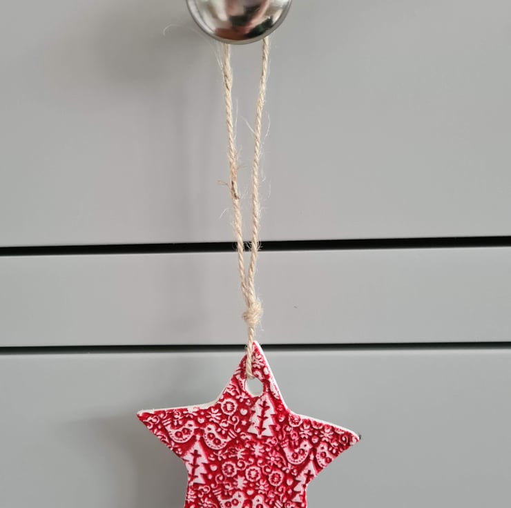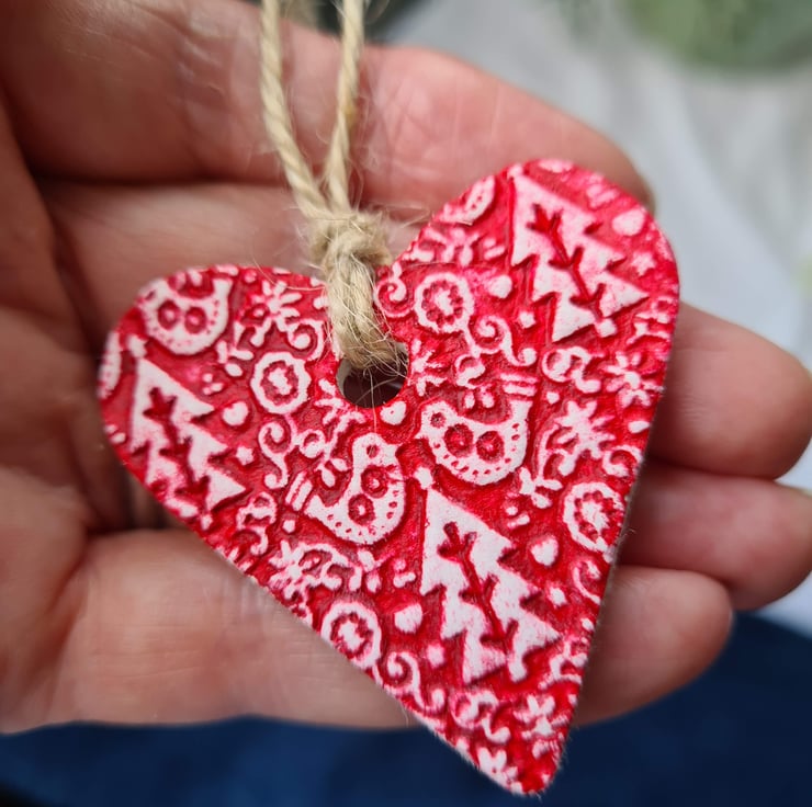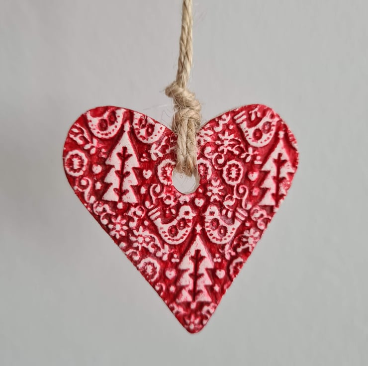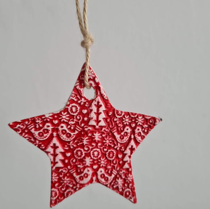This set of two scandi style Christmas hanging decorations are made from air drying clay which has been embossed and, when dry, lightly sanded and painted red. I then varnished them and finished with jute string.