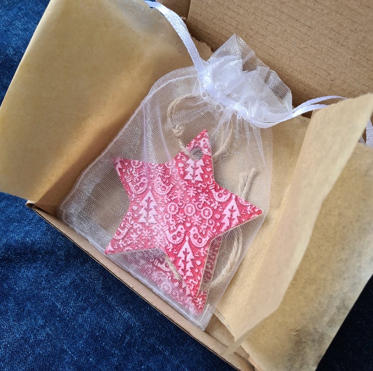 They not only look lovely on a Christmas tree, but also around the home, e.g. hanging from a handle or window or around a planter or vase. They are presented in a white organza bag, so would also make a lovely gift. I have left the reverse unvarnished, so they could be written on if desired, to use as a pretty gift tag, or to write a special message to make a lovely keepsake for the recipient. These could be cute little gifts from grandchildren to grandparent(s).