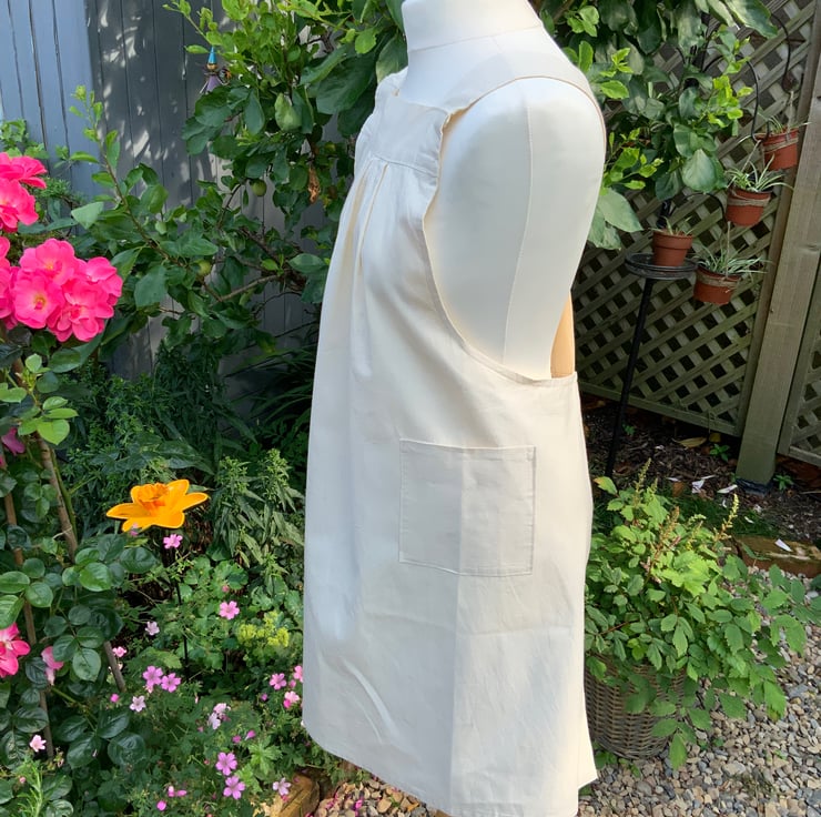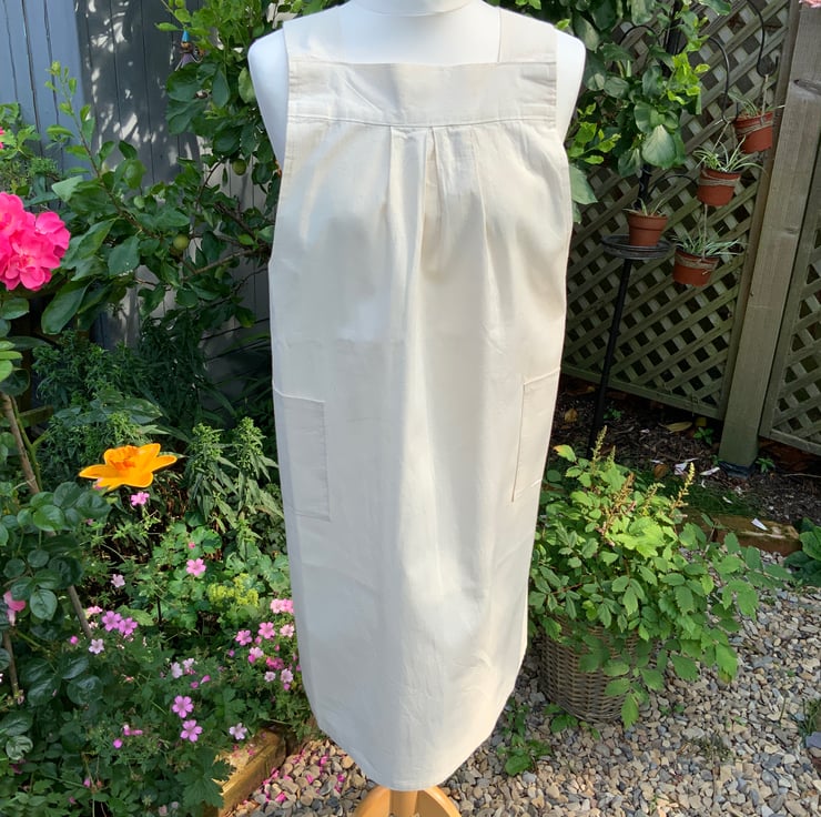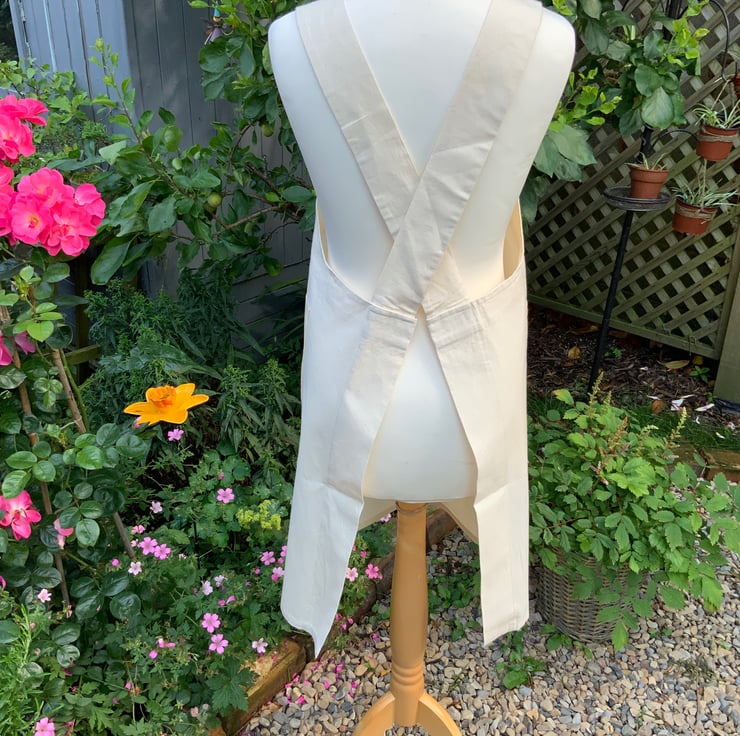 Handmade apron using my own pattern in cream, cotton fabric. With 2 patch pockets.