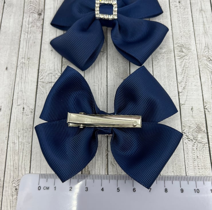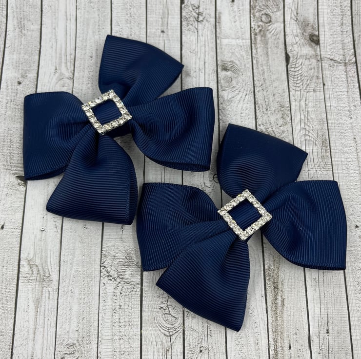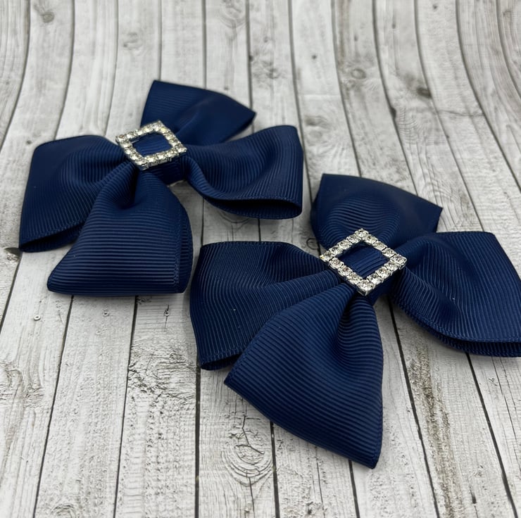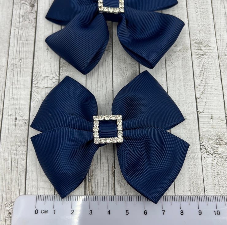 Navy Classic Double Bows with Square Diamond Buckle on Clips (pair)