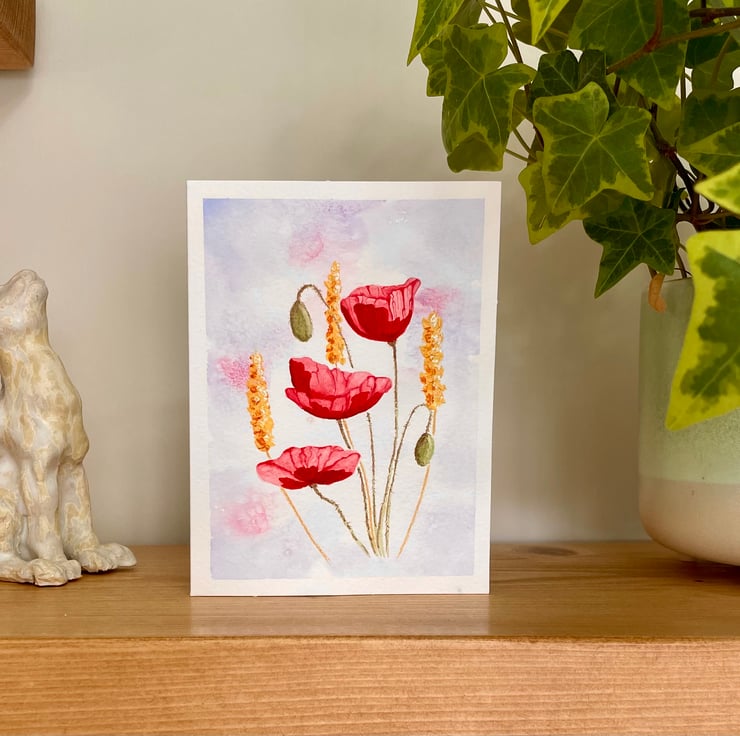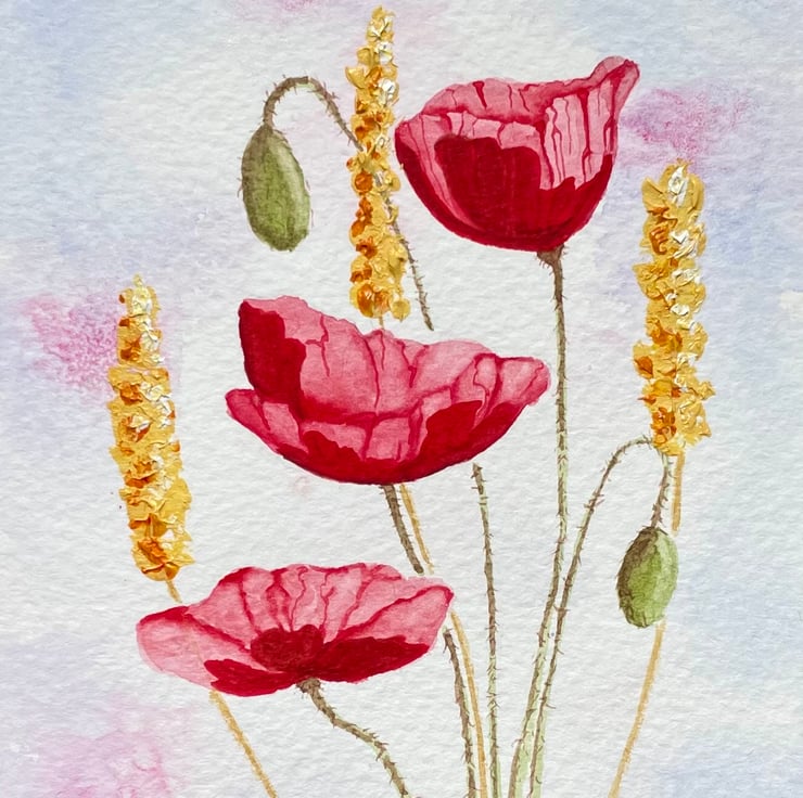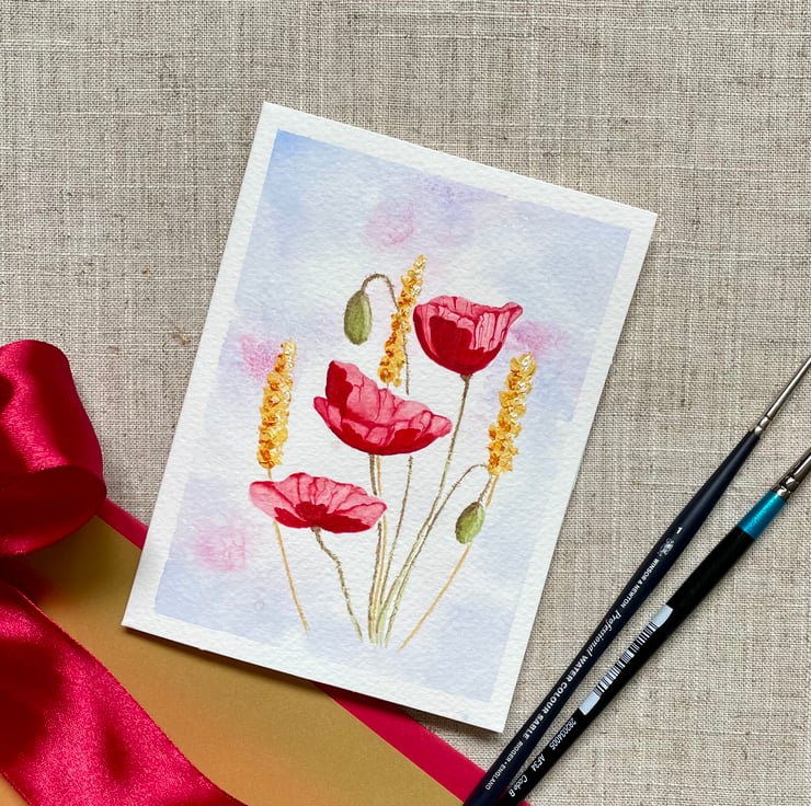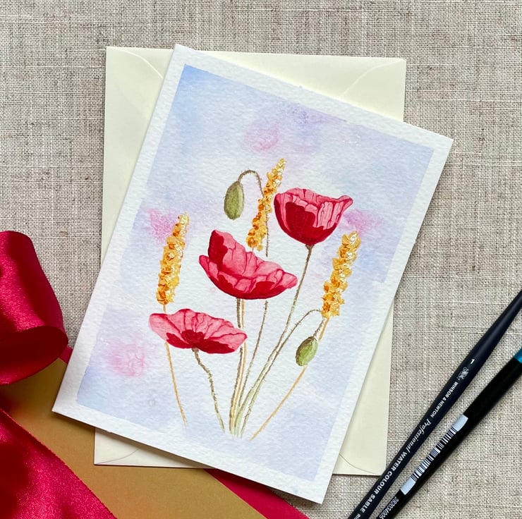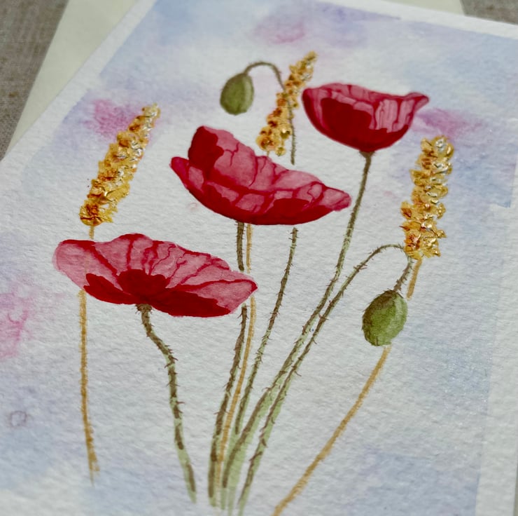 This hand painted card features a lovely wash blues and pink with bright red poppy flowers and three golden corn stems painted over the top.