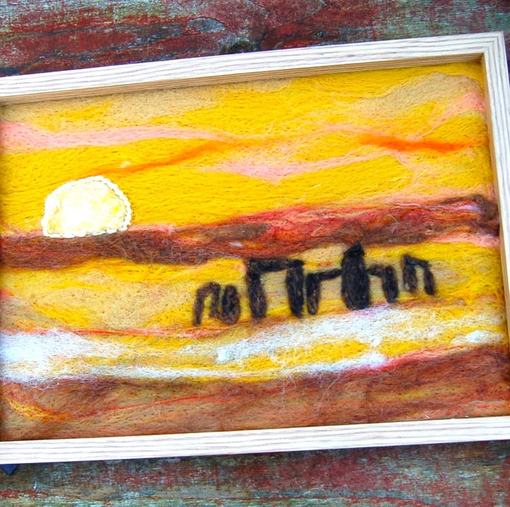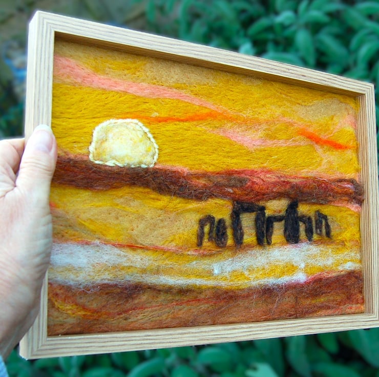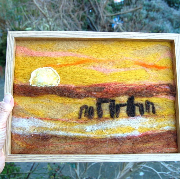 A needle felt landscape of the Summer Solstice at Stonehenge.