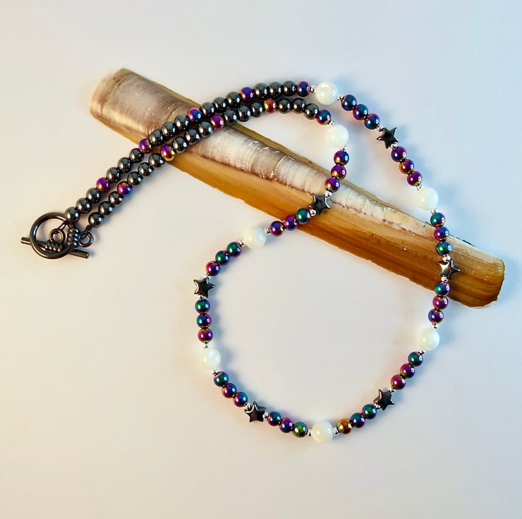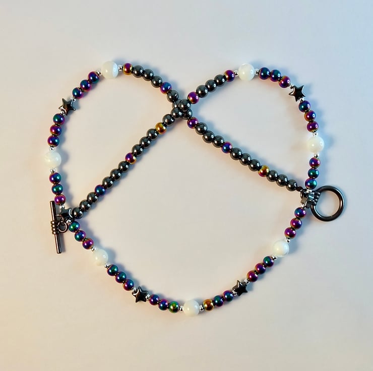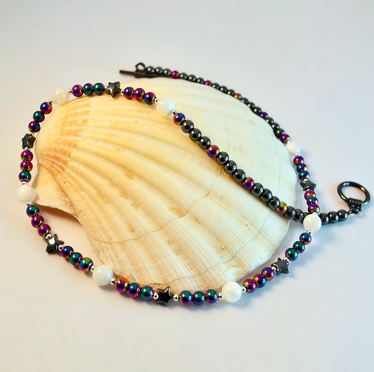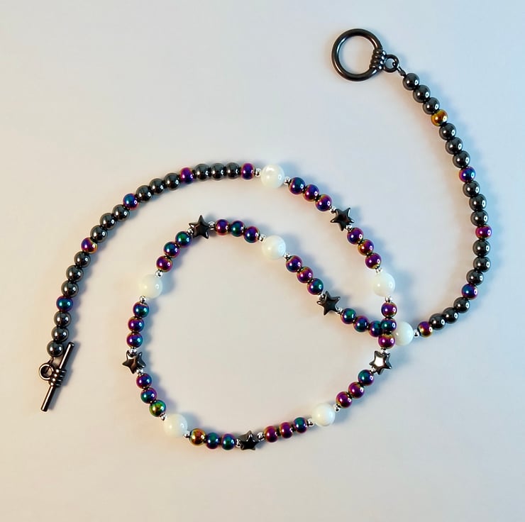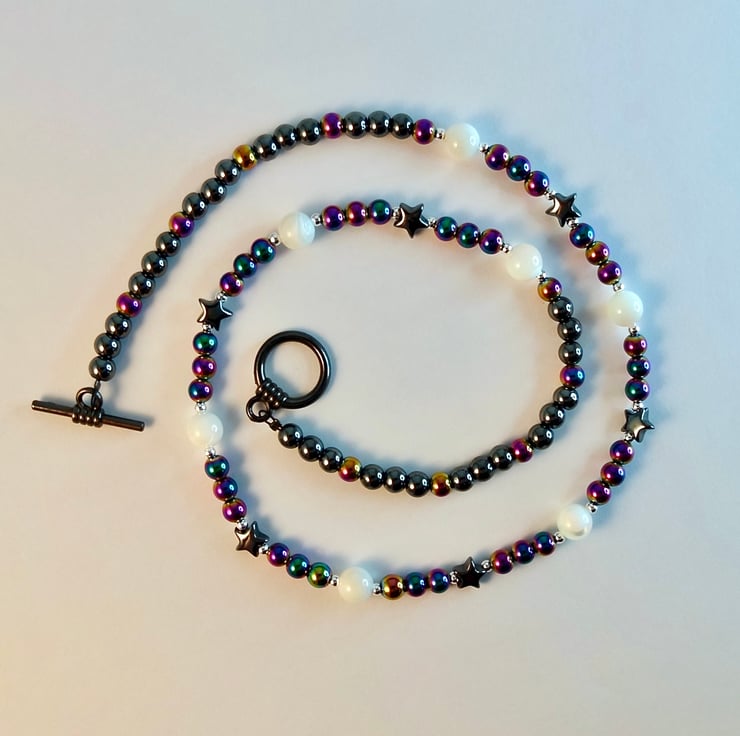 Colourful necklace of 4mm Rainbow Hematite beads set with 6mm Mother-of-Pearl and 6x4mm Hematite puffed stars.