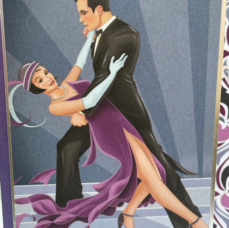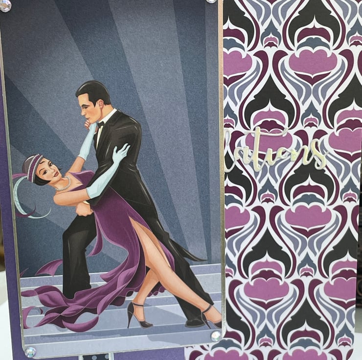From the most glamorous of eras, This lovely Art Deco card is just right for an anniversary or wedding. This A5 sized card features a beautifully dressed couple doing a fabulous dance. The card features a black, white and purple patterned paper which is topped with a silver congratulations die cut word. The front cover is folded back and features a purple pearlised paper topped with the main design of the dancing couple, the man in a tailed suit and the lady in a long flowing dress. He has swooped her into a deep dip. The design is finished with some clear faux gems and sparkly hearts. A very classy card to celebrate a wedding or anniversary.