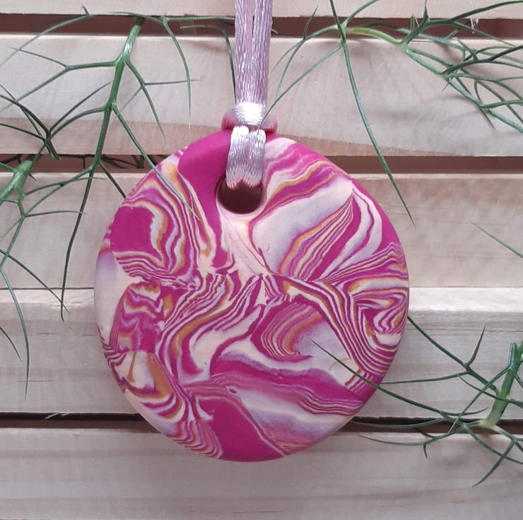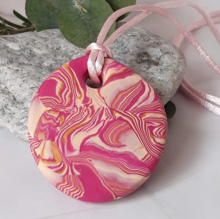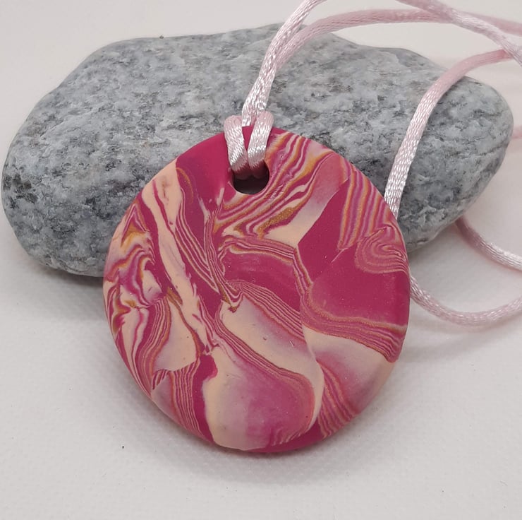 A lovely colourful round polymer clay pendant featuring hot pink, cream and gold polymer clay in a unique swirl design